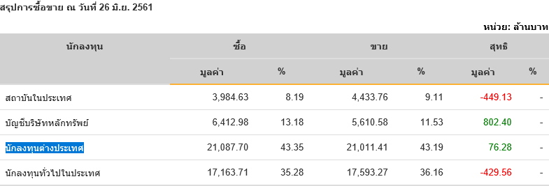 Sinthorn Summary 26/6/2561 : ต่างชาติซื้อสุทธิ 76.28 ลบ.