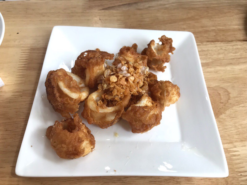 ตามต่อมาด้วย กุ้งทอดกระเทียม กับหมึกทอดกระเทียม รสชาติเดียวกัน เพราะชุบแป้งแบบเดียวกัน มาพร้อมน้ำจิ้มที่ผมจำรสชาติไม่ได้ (สงสัยกินอย่างอื่นเยอะกว่าเลยจำไม่ได้) แต่น่าจะเข้ากันได้อยู่