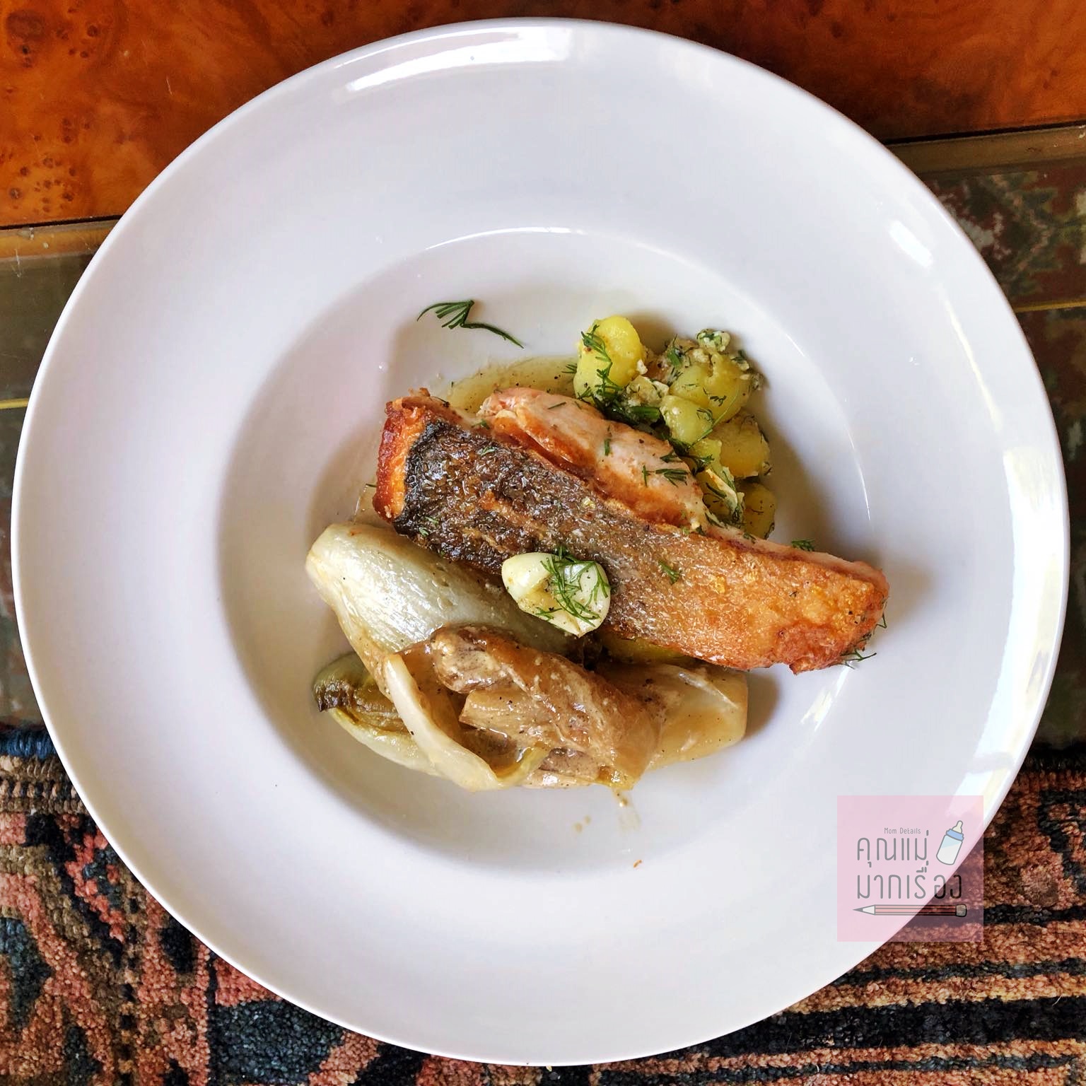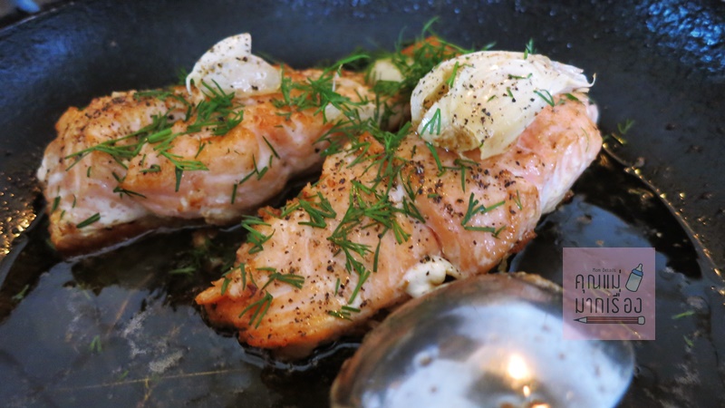 เอาด้านหนังลงกะทะก่อนได้หนังกรอบๆ บุบกระเทียมทั้งกลีบปรุงรสเกลือ+พริกไทย ใบผักชีลาว(Dill) ง่ายๆ
