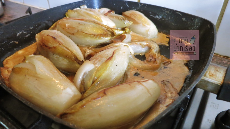 จานผักเป็น witlof แทนหน่อไม้ฝรั่งขาว รูปร่างเหมือนหัวปลีสีขาวๆ
