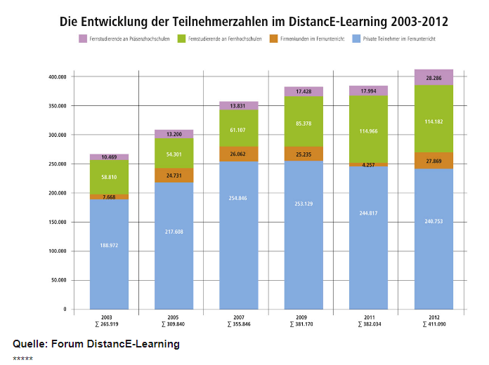 เยอรมนีครับ - การเรียน online กำลังเพิ่มความนิยมกันมากขึ้นเรื่อยๆ ดูจากกราฟข้างล่างนะครับ ปัจจุบันมีนักศึกษาเรียนกันอยู่มากกว่า 4 แสนคน และมีสถาบันที่เสนอหลักสูตรอยู่มากมายกว่า 1800 หลักสูตร จากหลักสูตรการเรียนทางไกลทั้งหมด 3045 หลักสูตร
