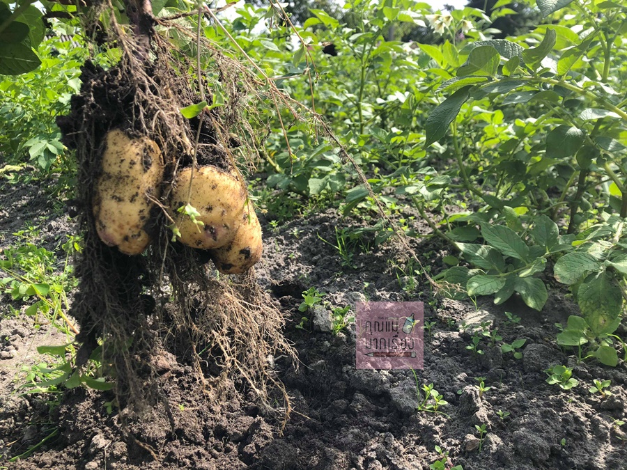 ขุดมันฝรั่งขึ้นมาจากดิน เก็บกลับบ้านมาด้วย น้องชายบอกว่า มันฝรั่งปลูกง่ายมาก แต่เอาลงดินมันก็งอกขึ้นมาใหม่อีกหลายต้น ปลูกง่ายมาก ให้ลองนึกภาพ มันฝรั่งที่เราซื้อลืมในตู้เย็นก็คงจะประมาณนั้น 555