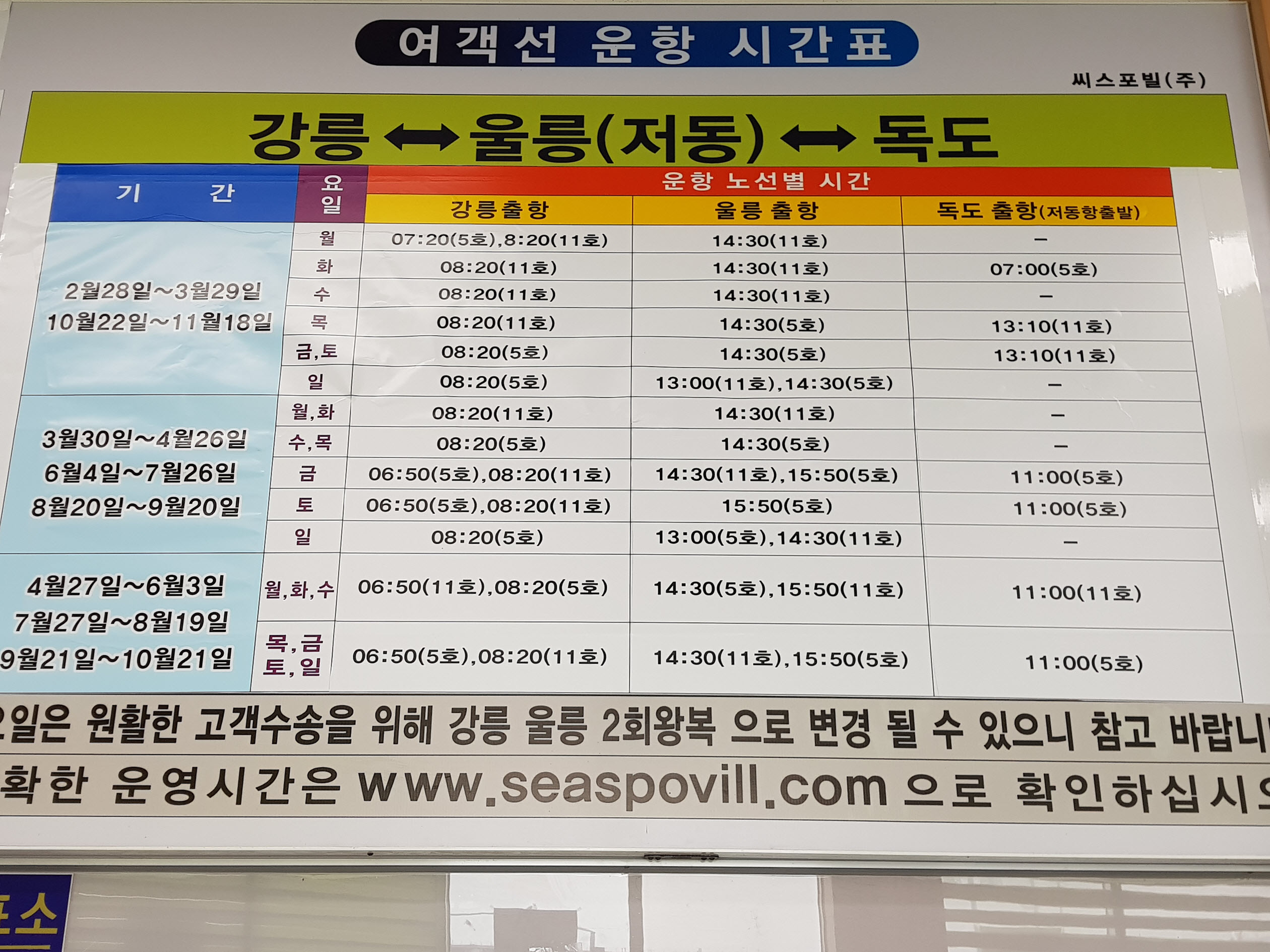 ตารางเรือรูปนี้ผมถ่ายมาจากท่าเรือบนเกาะครับ มีระบุรอบเรือทั้งจากท่าคังนึง อุลลึง และด๊กโด ดูได้จากคอลลัมน์ตามแถบสีส้ม ส่วนคอลลัมน์ซ้ายสุดสีฟ้าจะระบุรอบเรือในแต่ล่ะช่วงเวลาของปี เช่น ในกล่องสีฟ้าบนสุด จะใช้สำหรับตารางเรือช่วงเดือน 2 วันที่ 28 ไปจนถึง เดือน 3 วันที่ 29 และช่วงเดือน 10 วันที่ 22 ไปจนถึง เดือน 11 วันที่ 18 ในขณะที่คอลลัมน์ขวาเล็กๆ ถัดมาจะบอกวันในสัปดาห์ ไล่จาก จันทร์ อังคาร พุธ พฤหัส ศุกร์เสาร์อยู่ด้วยกัน และอาทิตย์ครับ (มีหกช่อง)