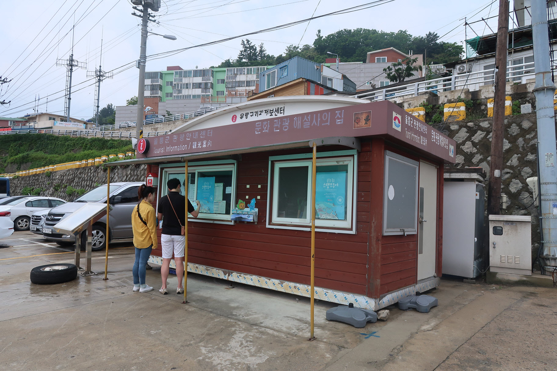 ข้อแนะนำเพิ่มเติม คือ ทันทีที่ขึ้นจากเรือนะครับ อย่าลืมเดินไปหยิบแผนที่และตารางรถเมล์บนเกาะที่ Tourist Information ซึ่งเป็นอาคารไม้หลังเล็กๆ อยู่ในรัศมีไม่เกิน 100 เมตรจากทั้งสองท่าเรือ ในแผ่นพับมีข้อมูลแนะนำการท่องเที่ยว แบ่งออกเป็นสามเขตใหญ่ คือ 1. เขตพุกมยอน (Buk-Myeon) อยู่ด้านบนของเกาะและเป็นจุดต่อรถเมล์ที่เมืองชอนบู (Cheonbu) 2. เขตอุลลึงอึบ (Ulleung-Eup) ที่ตั้งท่าเรือชอดง/โดดง และ 3. เขตซอมยอน (Seo-Myeon) อยู่ด้านตะวันตกของเกาะ นอกจากนี้ ในแผ่นพับยังมีตารางรถเมล์ระบุเวลาทั้งขาไปและขากลับของเส้นทาง ชอดง-โดดง เส้นทางเลียบริมเกาะทางด้านซ้ายจนสิ้นสุดที่เมืองชอนบูและเส้นทางจากชอนบูไปยังเกาะควันอึมโด (Gwan-Am-Do) สิ่งที่ลำบากอย่างนึงในการขึ้นรถประจำทางบนเกาะสำหรับนักท่องเที่ยวต่างชาติ คือตารางเวลาและป้ายหน้ารถเมล์ที่เขียนเป็นภาษาเกาหลีทั้งหมด เพราะฉะนั้น ควรเตรียมตัวเรื่องชื่อของสถานที่สำคัญเป็นภาษาเกาหลีให้พร้อม หรือจะขอให้ Tourist Information ช่วยเขียนคำอ่านเป็นอังกฤษกำกับไว้บนตารางเวลาให้ก็ได้ครับ ถ้าพออ่านคำเกาหลีออกบ้างจะสะดวกขึ้นเยอะเลยล่ะครับ