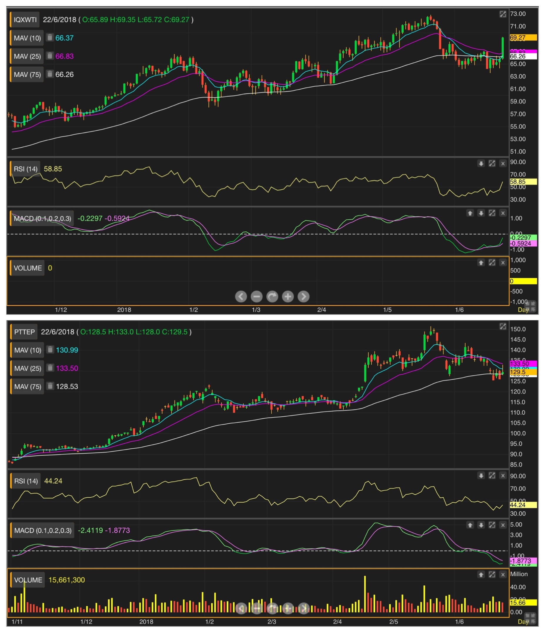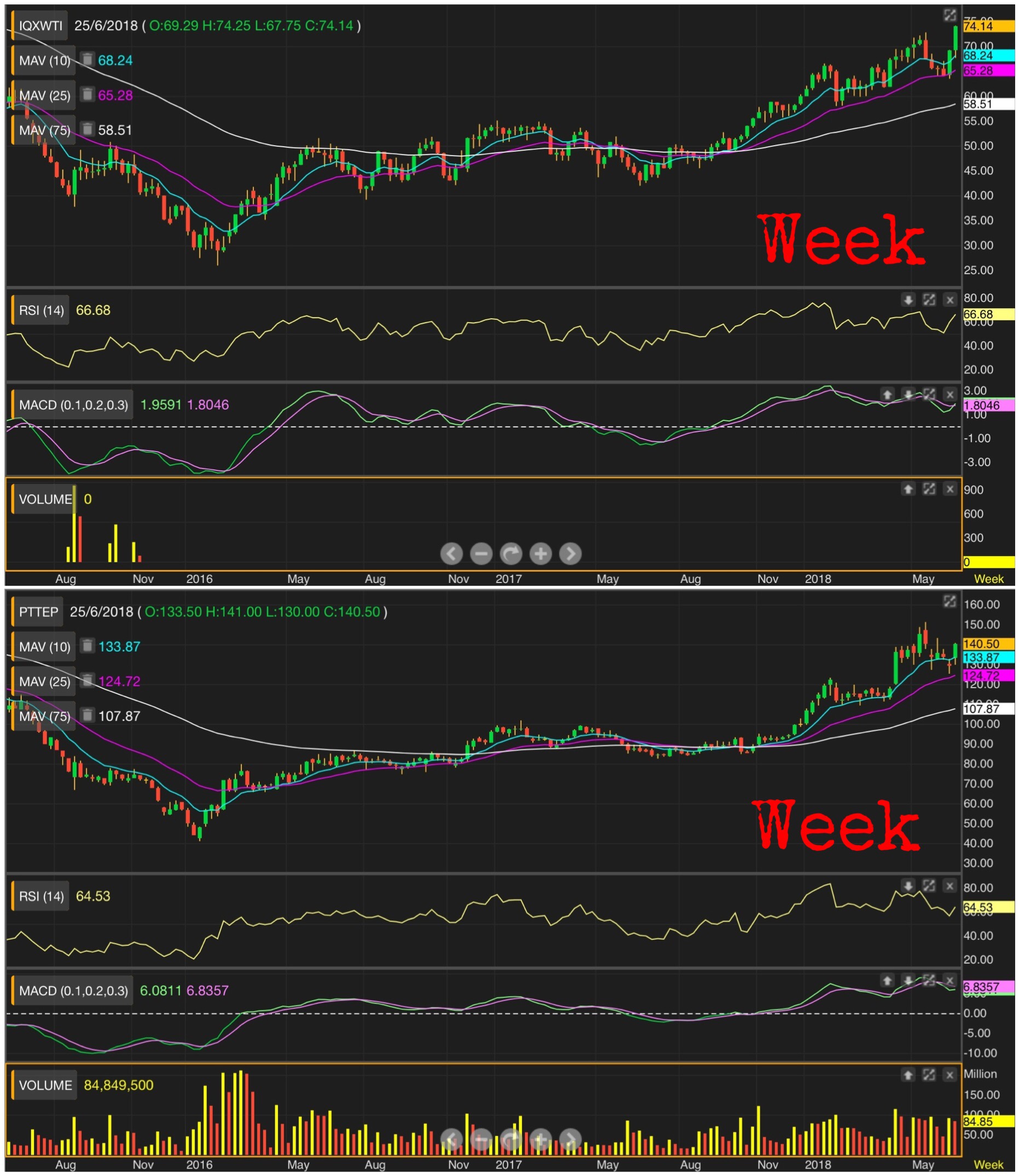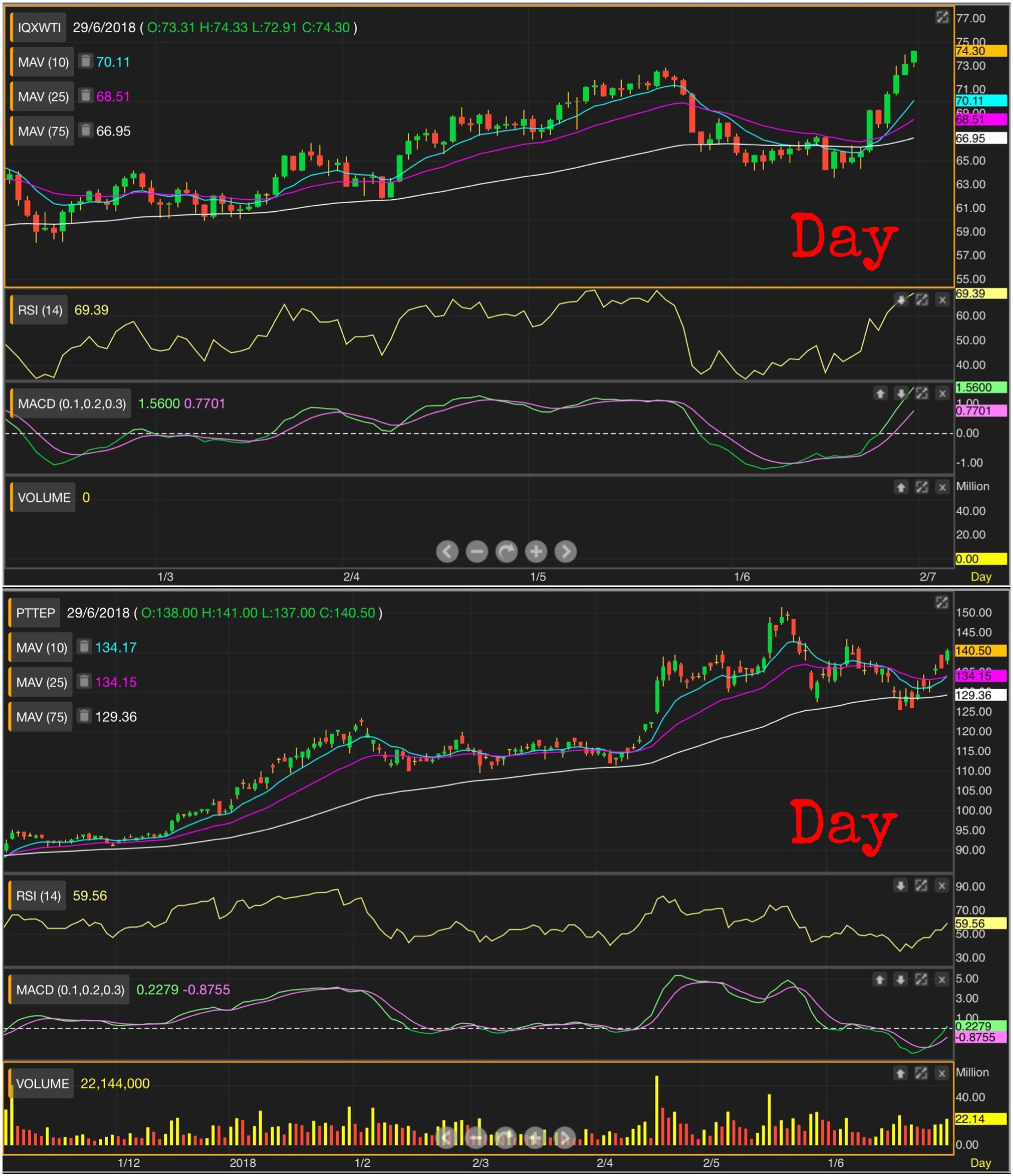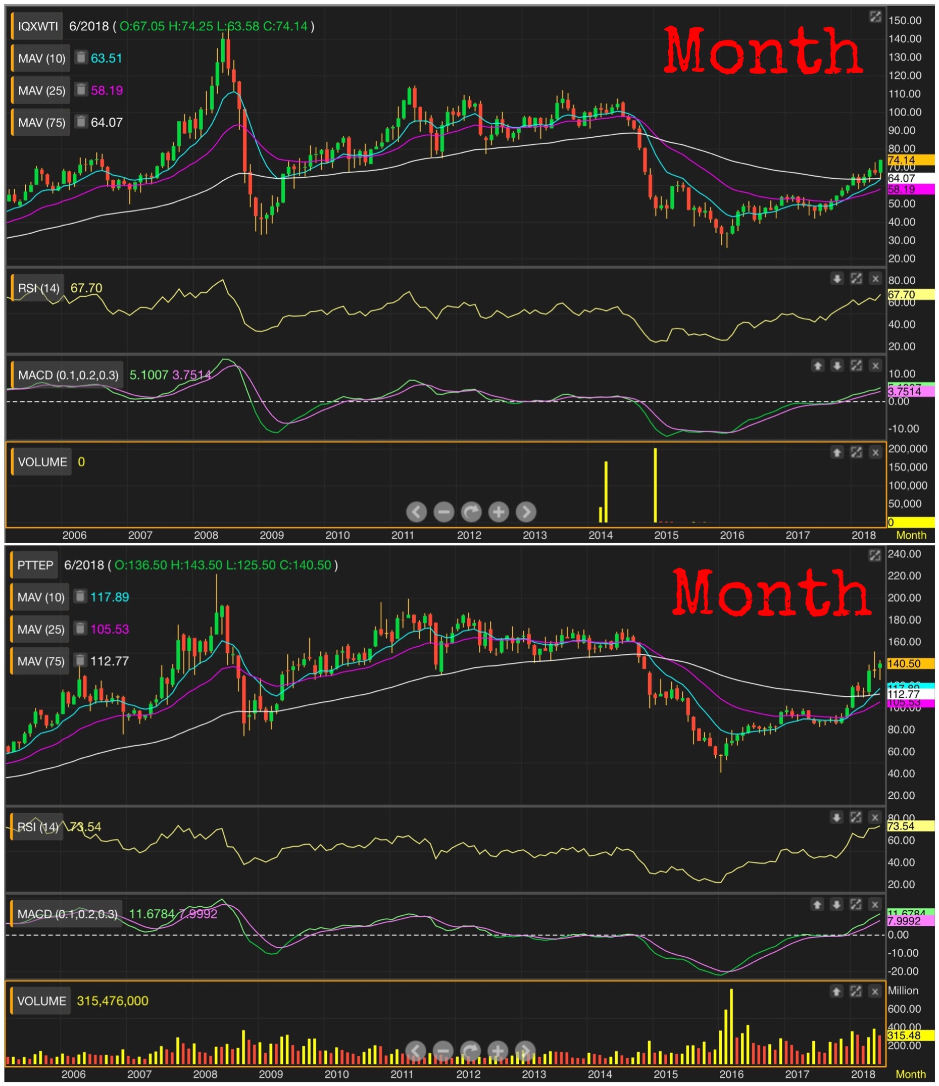 ซึ่งถ้าไปดูภาพใหญ่ จะเห็นว่า น้ำมันยังไม่เคยเป็นขาลง ตั้งแต่ 30 เหรียญเป็นต้นมา