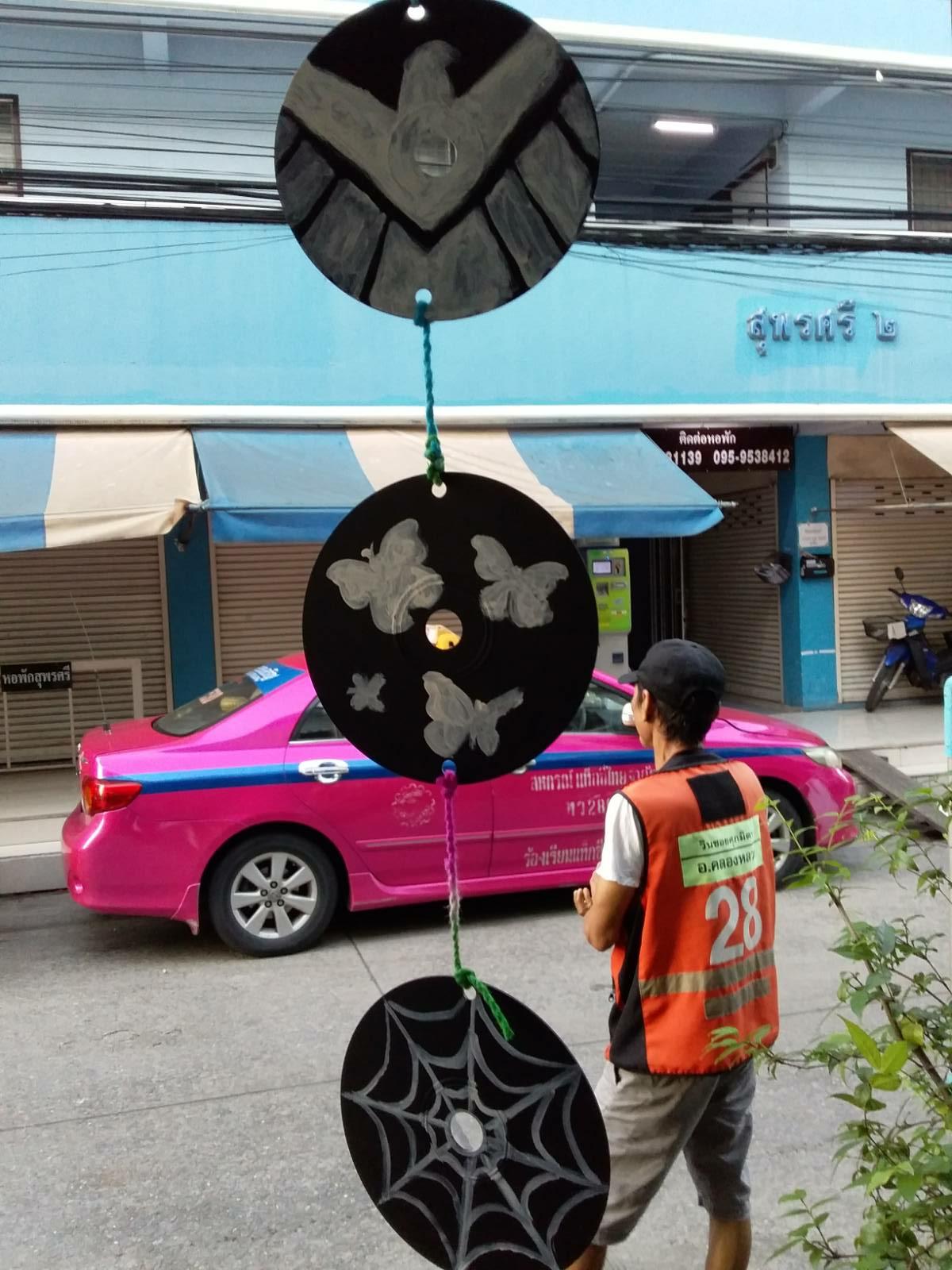 ตอนแรกก็พ่นสีแล้ว เอาสีโปสเตอร์ไปทาเป็รลวดลาย คิดว่าถ้าลงแลกเกอร์น่าจะสวยกว่านี้ ขยะซีดีมีเยอะก็เลยคิดว่าจะทำไรดี