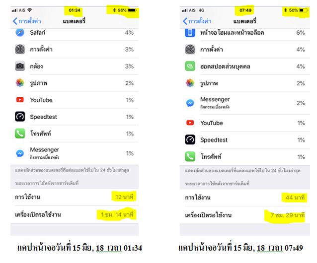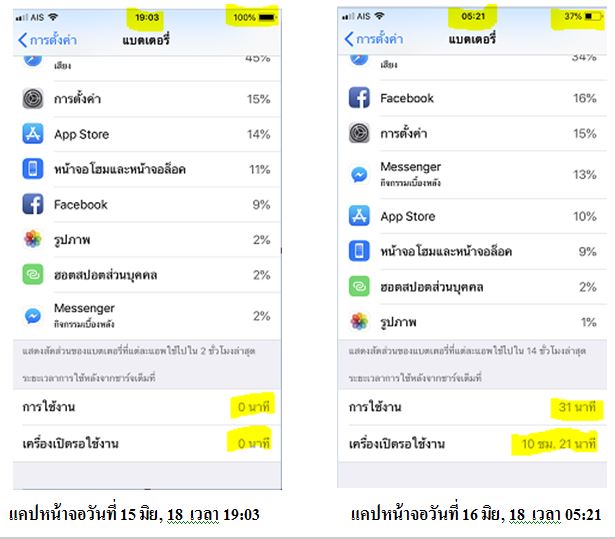 หลังจากรับเครื่องที่ลง ios ใหม่กลับมาผมก็ทำแบบเดิมชาร์จเต็ม100% ตอนประมาณ1 ทุ่มชักสายชาร์จออก แล้วแสตนบายเครื่องไว้ เช้าตื่นมาดูตอนตี5ปรากฏว่าเหลือ37% ซึ่งมันผิดปกติ