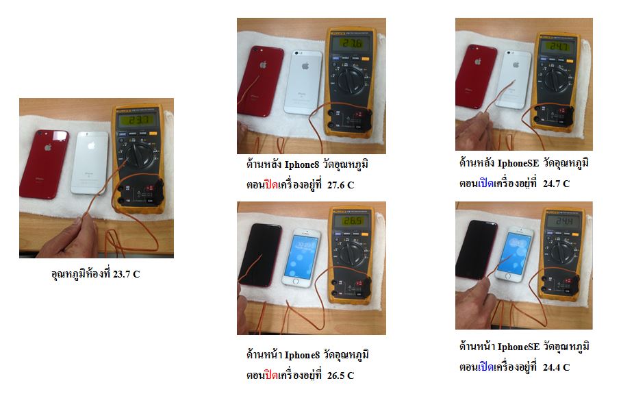 แต่ผมกลัวว่าเค้าจะไม่เปลี่ยนเครื่องให้ เพราะอาการไม่ชัดเจน อาจจะเป็นจากเราใช้งานเยอะจนแบตหมด ผมเลยลองใหม่ ชาร์จเต็ม100% แล้วทีนี้ปิดเครื่องเลย กะว่าทิ้งไว้ ซักพักเดี๋ยวค่อยเปิดดูว่าแบตจะลดมั้ย จากนั้นก็ได้สังเกตเจออาการผิดปกติที่ชัดเจน คือตัวเครื่อง Iphone8 ที่ปิดอยู่มีอาการอุ่นตลอดเวลา อุ่นกว่าตัวเครื่อง IphoneSE เครื่องเก่าของผมที่เปิดอยู่อีก เลยจับเทอร์โมมิเตอร์มาวัดเก็บค่าไว้ให้ทาง iCare ดูเป็นหลักฐานว่าผมลองอะไรมาบ้าง