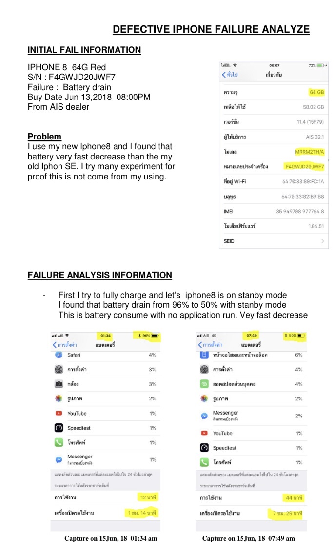 เรื่องมีอยู่ว่า เมื่อเย็นวันที่13มิถุนา ที่ผ่านมา ผมไปซื้อ Iphone 8 64G Red เครื่องใหม่มาจากค่าย AIS หลังจากนั้นวันรุ่งขึ้น(14 มิถุนา) ผมได้เริ่มใช้เครื่องวันแรก รู้สึกว่าแบตมันหมดเร็วกว่า IphoneSE เครื่องเก่าที่ใช้งานอยู่ คือปกติใช้ทั้งวันตอนเย็นจะเหลือแบตประมาณ 40-50% แต่ Iphone8 เครื่องใหม่ผมมันเหลือ10% หลังจากนั้นพอเปิดเล่นไม่ถึง5นาทีจาก 10%ลดเหลือ 1%ไวมากจนแทบดับเลยต้องรีบชาร์จเข้าไป