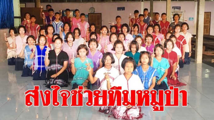 โรงเรียนบ้านพอ อ.พบพระ จ.ตาก เด็กนักเรียนชนเผ่าปากะญอ พร้อมคณะครูร่วมกันจุดเทียนสวดมนต์ เพื่ออธิษฐานส่งกำลังใจให้ทีมฟุตบอลหมูป่า อะคาเดมี 13 ชีวิต ที่ติดอยู่ในถ้ำหลวง ขุนน้ำนางนอน ต.โป่งผา อ.แม่สาย จ.เชียงราย ตั้งแต่ช่วงบ่าย ของวันเสาร์ที่ 23 มิ.ย. ที่ผ่านมา