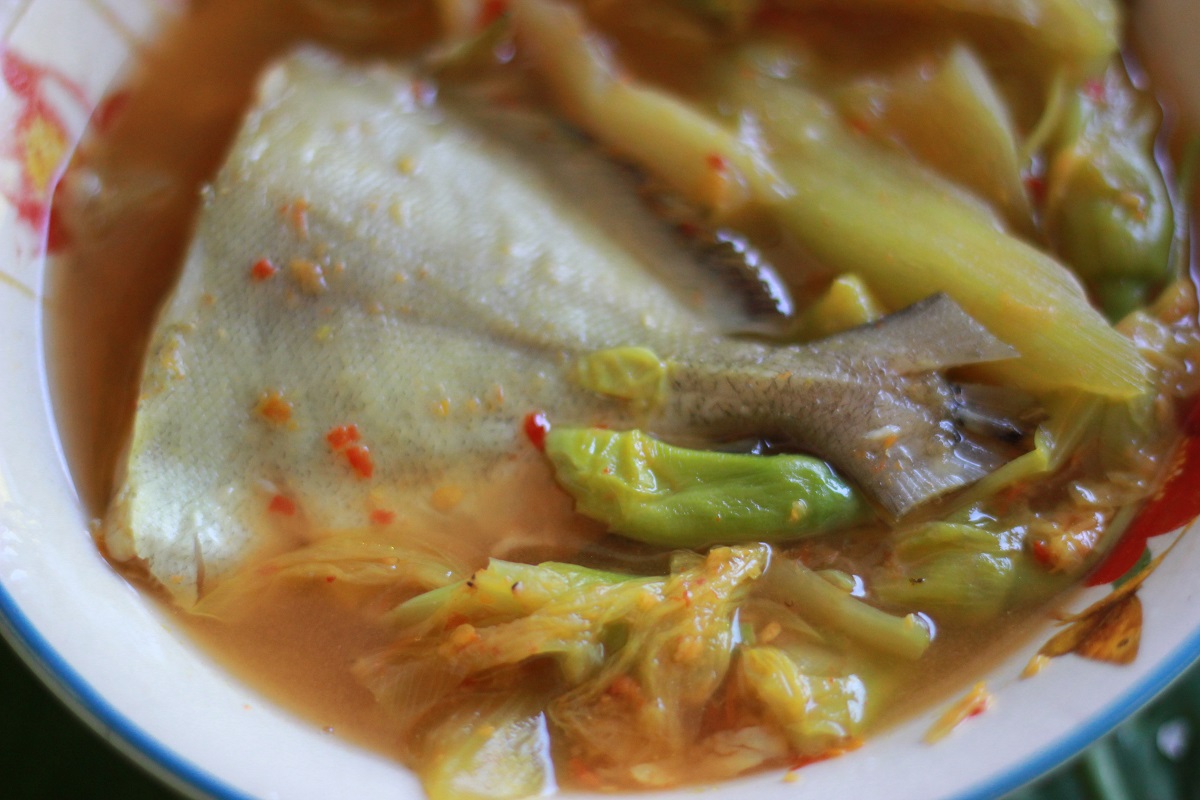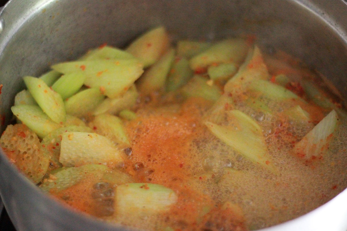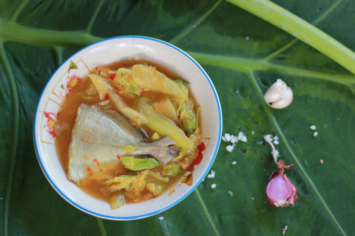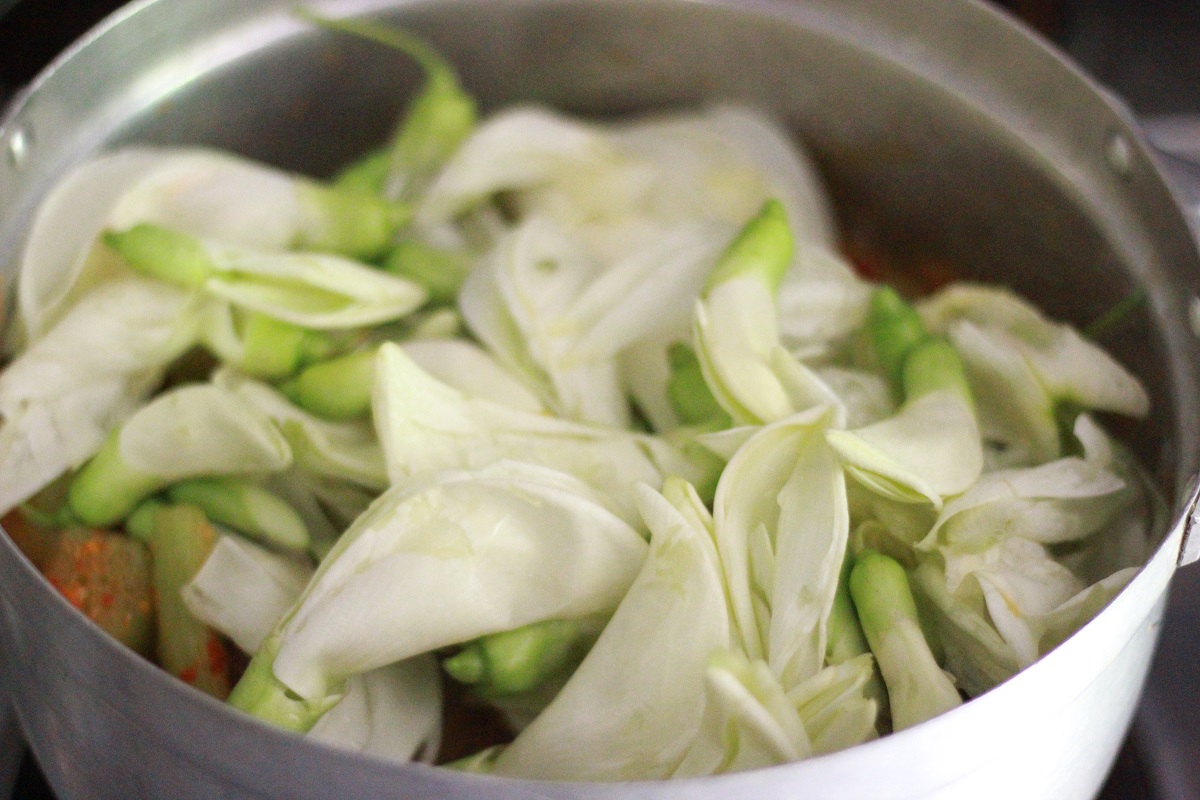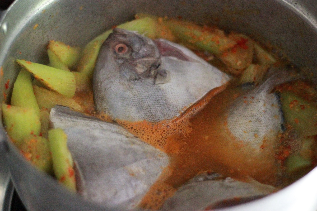 สุกแล้วใส่ปลา และดอกแคลงไป ปิดฝาหม้อและห้ามคนจนกว่าปลาจะสุก