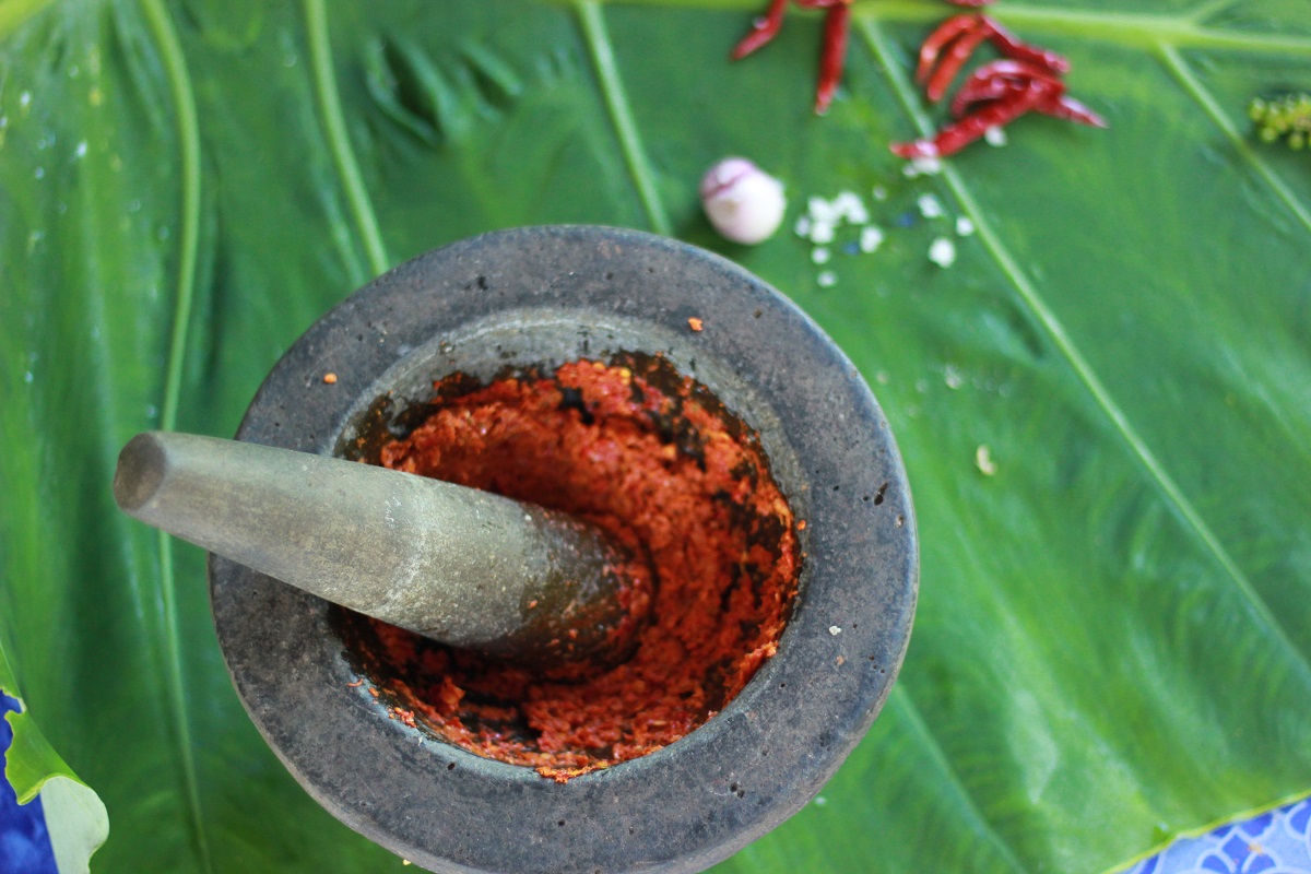 ขั้นแรกต้องทิ่มเครื่องแกง เราใช้ทั้งพริกแห้งและพริกสดผสมกันนะคะ เพราะพริกสดเราไม่พอ 5555
