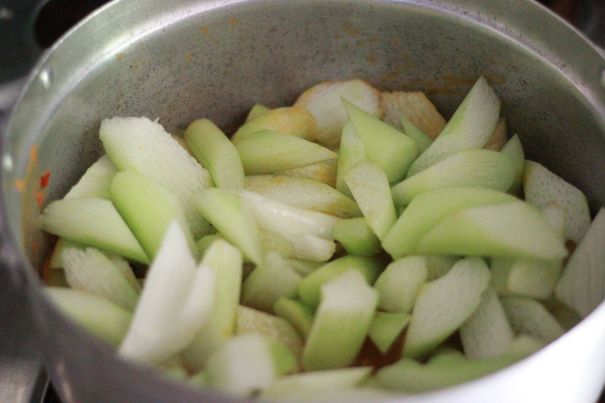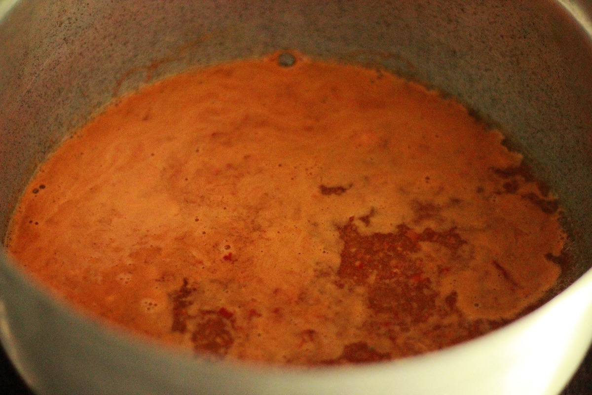 พร้อมแล้วมาแกงกัน ตั้งน้ำเดือดจัด (น้ำไม่ต้องเยอะมากเพราะเดี๋ยวจะมีน้ำจากผักและเครื่องปรุงออกมาอีก) แล้วละลายเครื่องแกงลงไป