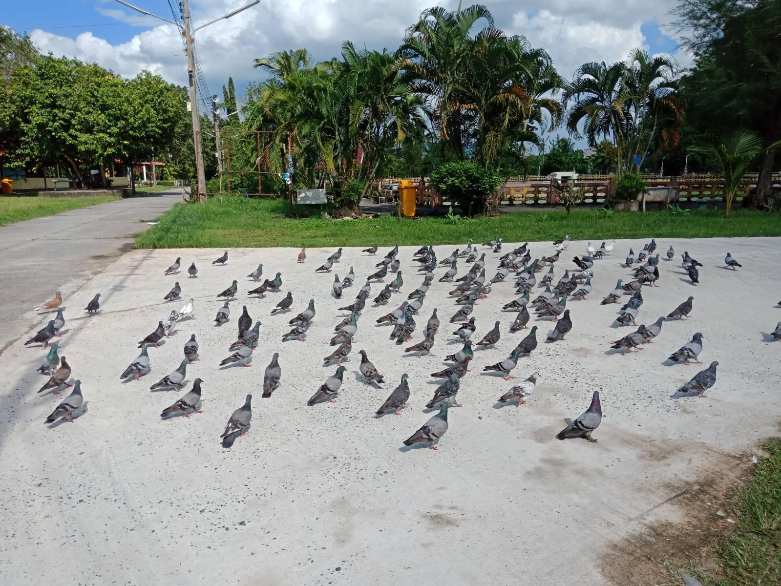 วันนี้เลยลองเอาไปที่วัดใกล้บ้าน ซึ่งคิดว่าน่าจะเป็นบ้านเก่าเดี้ยง เพราะที่นี่นกพิราบเต็มไปหมด