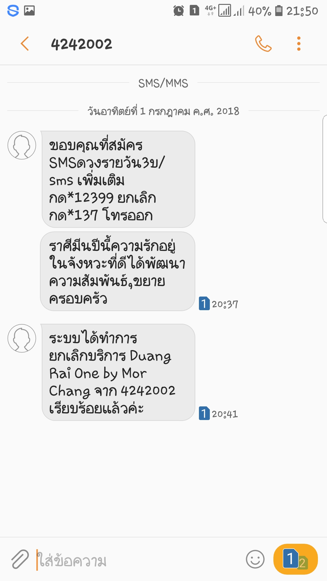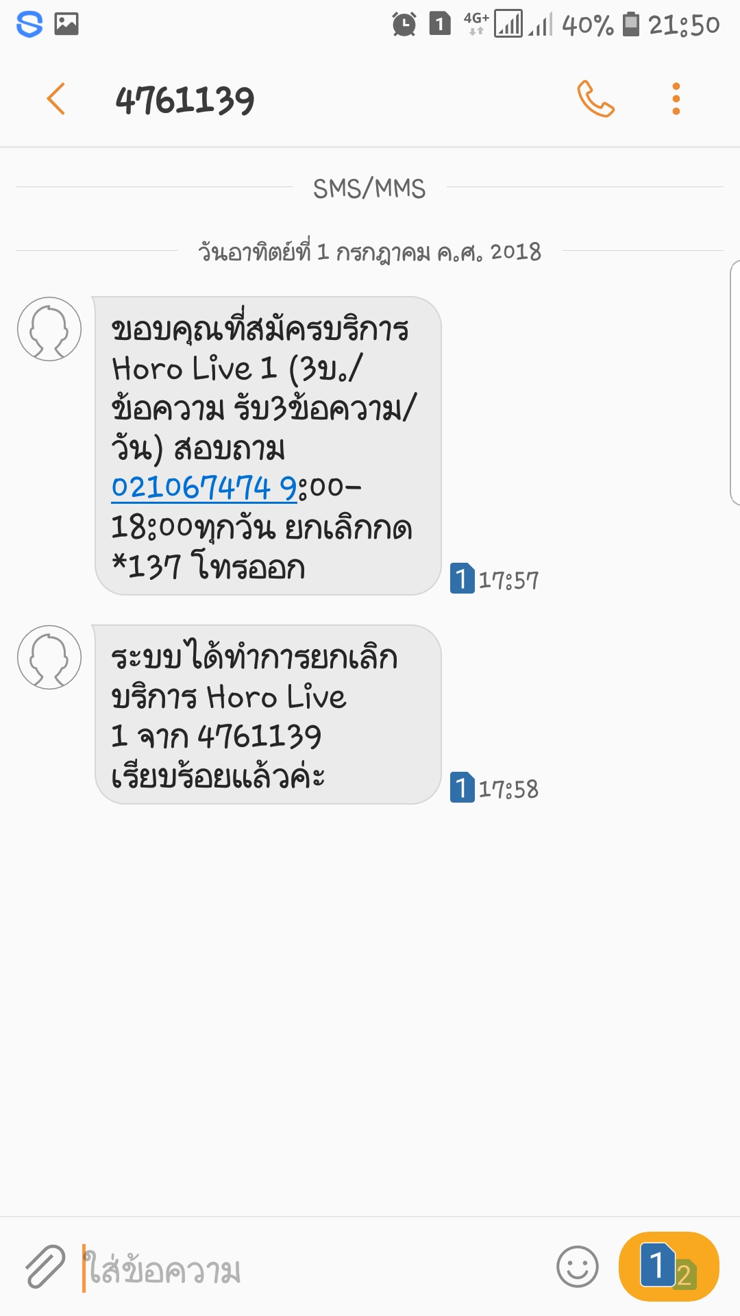 คือว่าวันนี้ผมต้องจ่ายค่าเน็ตต่ออายุอัตโนมัติ ผมจึงเติมเงินเข้าซิมไป แต่ว่าจู่ๆก็มี SMS เด้งมาเยอะมาก เป็น sms ที่เสียเงิน แต่ว่าผมไม่เคยสมัคร sms พวกนี้เลย ผมจึงโทร *137 เพื่อยกเลิก sms ที่เสียเงิน แ