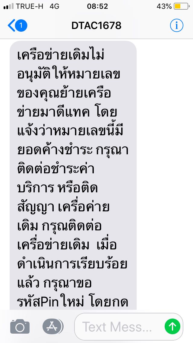 สวัสดีครับ อยากทราบสถานะการย้ายค่าย จาก ais ไป true เบอร์ 063XXX8308 ทำเรื่องย้ายไป2ครั้ง ครั้งที่1 วันที่ 28/11/2568 ย้ายไม่ได้มี SMS แจ้งว่า ผู้ให้บริการรายเดิมปฏิเสธการโอนย้ายโดยแจ้งว่ารหัสแสดงตนไ