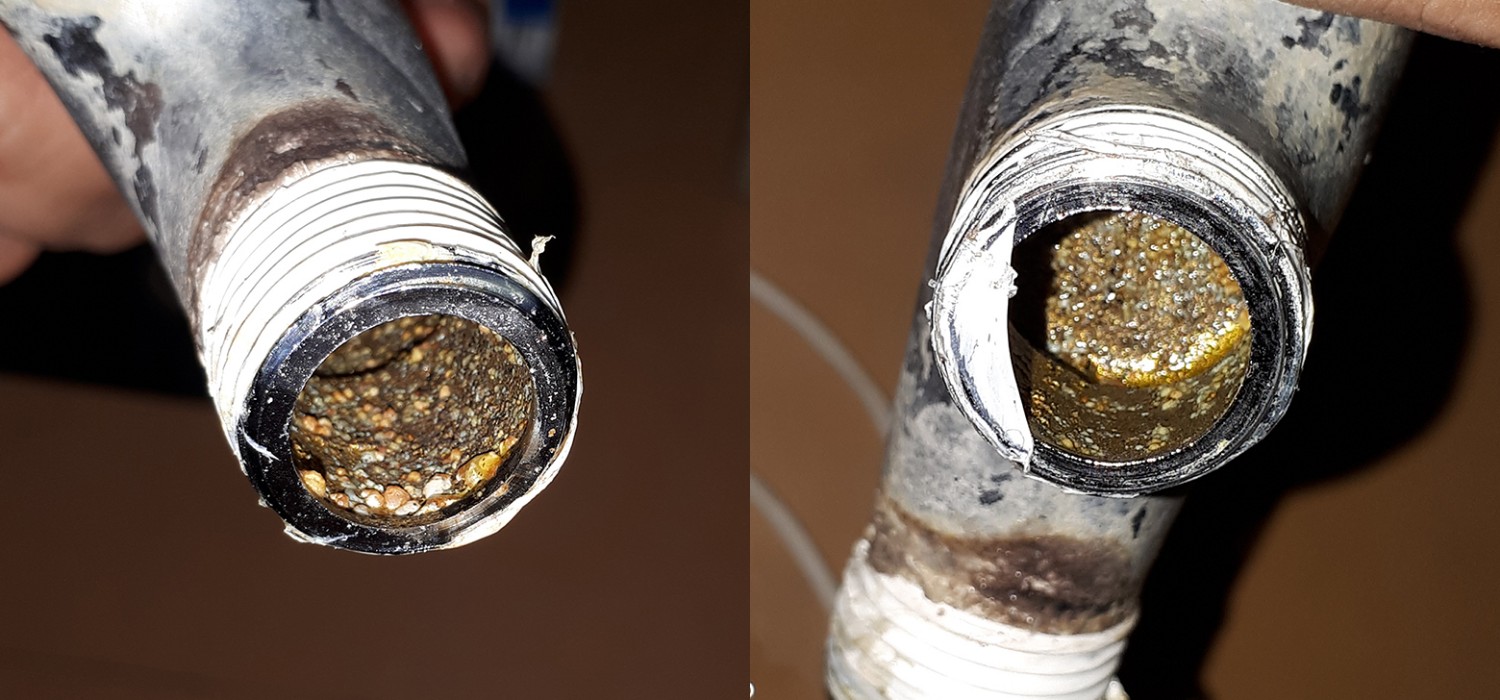 พอถอดออกมาแล้วส่องดู เห็นก้อนสีเหลือง ก้อนเล็กๆแบบในรูปเกาะอยู่ตามผิวด้านในก็อกเต็มไปหมด