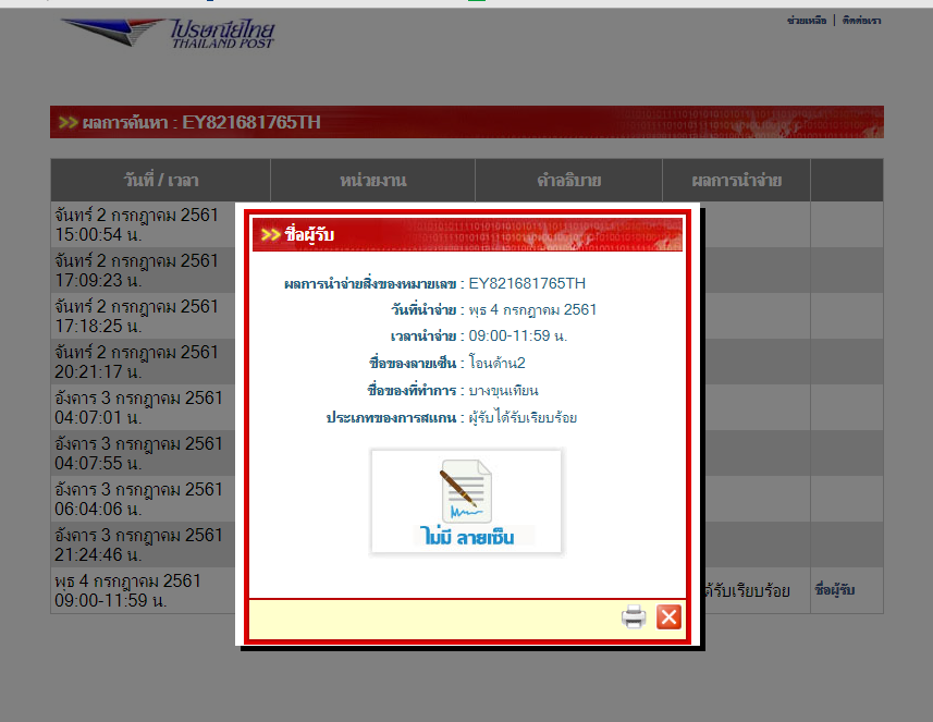 ศูนย์บริการลูกค้าไปรษณีย์ 1545 จากการตรวจสอบ พบสถานะสิ่งของดังนี้ EY821681765TH /7/2561 B บางขุนเทียน สถานะการนำจ่าย ผู้รับได้รับเรียบร้อย โอนด้านจ่ายที่ 2 นำจ่ายให้ผู้รับในวันทำการถัดไปครับ