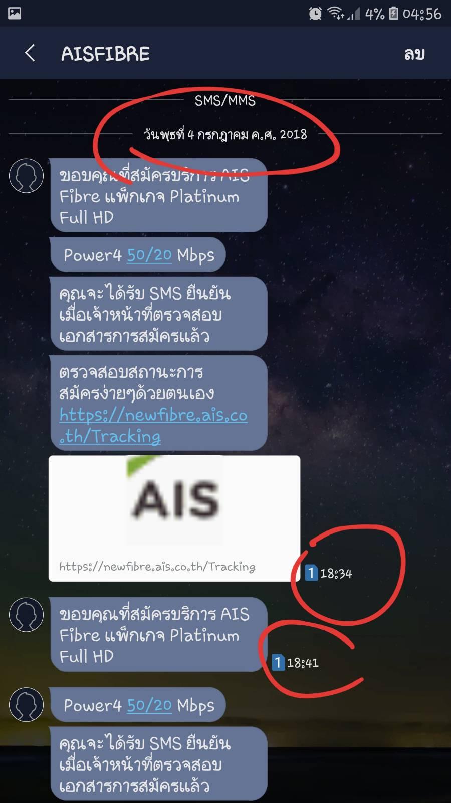 พึ่งได้รับข้อความจาก ais fibre ก็ลองกดเข้าไปดู เป็นการตรวจสอบขั้นตอนของการติดตั้งอินเตอร์ซึ่งระบุวันสมัครเป็นวันที่ 4 และระบุวันนัดติดตั้งเผ็ยวันที่ 6 และไหนคุณบอกว่าก่อนติดตั้งจะมีช่างติดต่อนัดวันไงครับ ผมไม่ได้รับการติดต่อเกี่ยวกับการนัดวันเลยแล้วคุณม่ระบุแบบนี้ได้ยังไง ที่โพสนี้ไม่ได้ต้องการอะไรหรอกน่ะครับ แค่อยากให้พวกคุณเห็นว่าการทำงานแบบนี้มันแย่ ปย่ตั้งแต่การโยนความผิดไปมา ข้อมูลแจ้งลค.ก็ไม่ตรงกัน ตอนนี้รู้สึกไม่อยากใช้บริการของ ais แล้วสมจริงๆกับสโลแกน " ที่ 1 ดูแลด้วยใจ ให้ชีวิตดิจิทัล "