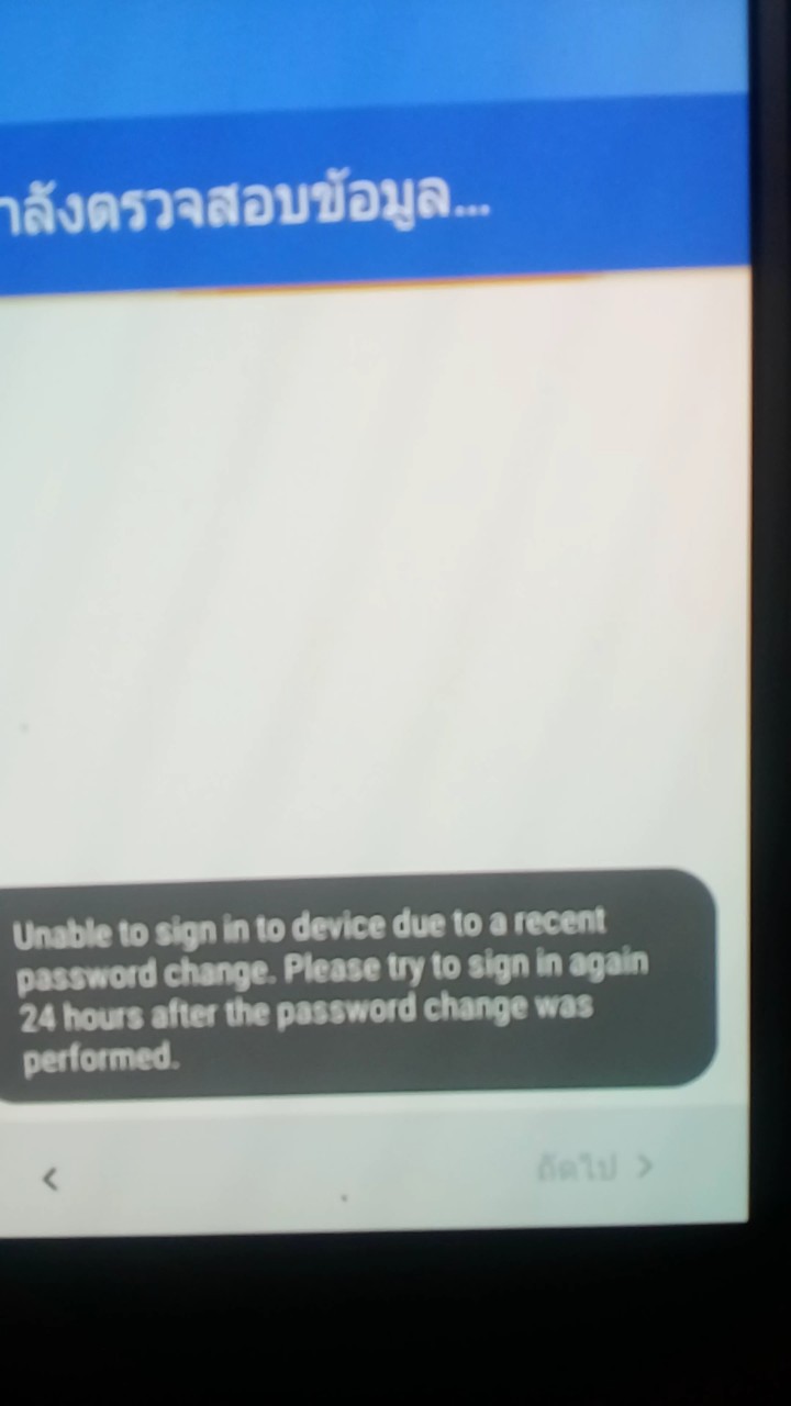 unable to sign into device due to a recent password change please try to sign in again 24 hours อยู่หน้านี้มาประมาณ5วันแล้ว เนื่องจากกด factory reset แล้วก็ใส่รหัสไม่ผ่าน เลยเลือกลืมรหัสและไปตั้งค่าใหม่ ระบบให้รอ24ชม. หลังจากนั้นก็ลองเข้าใหม่ ก็ยังไม่ได้ จนตอนนี้ก็ยังค้างอยู่ที่หน้านี้ ให้ใส่เมล์ แต่พยายามใส่แล้ว ก็ไม่ได้