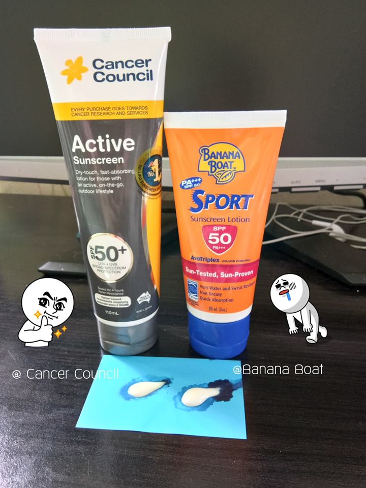 จะเห็นได้ชัดเจนเลยว่า ตัว Banana Boat -จะมีความมันมากกว่า จริงๆ ฉะนั้นจึงไม่คุมมันค่ะ ส่วนตัว Cancer Council จะเห็นได้ชัดเจนเลยว่าแทบจะไม่มีน้ำมันไหลออกมา