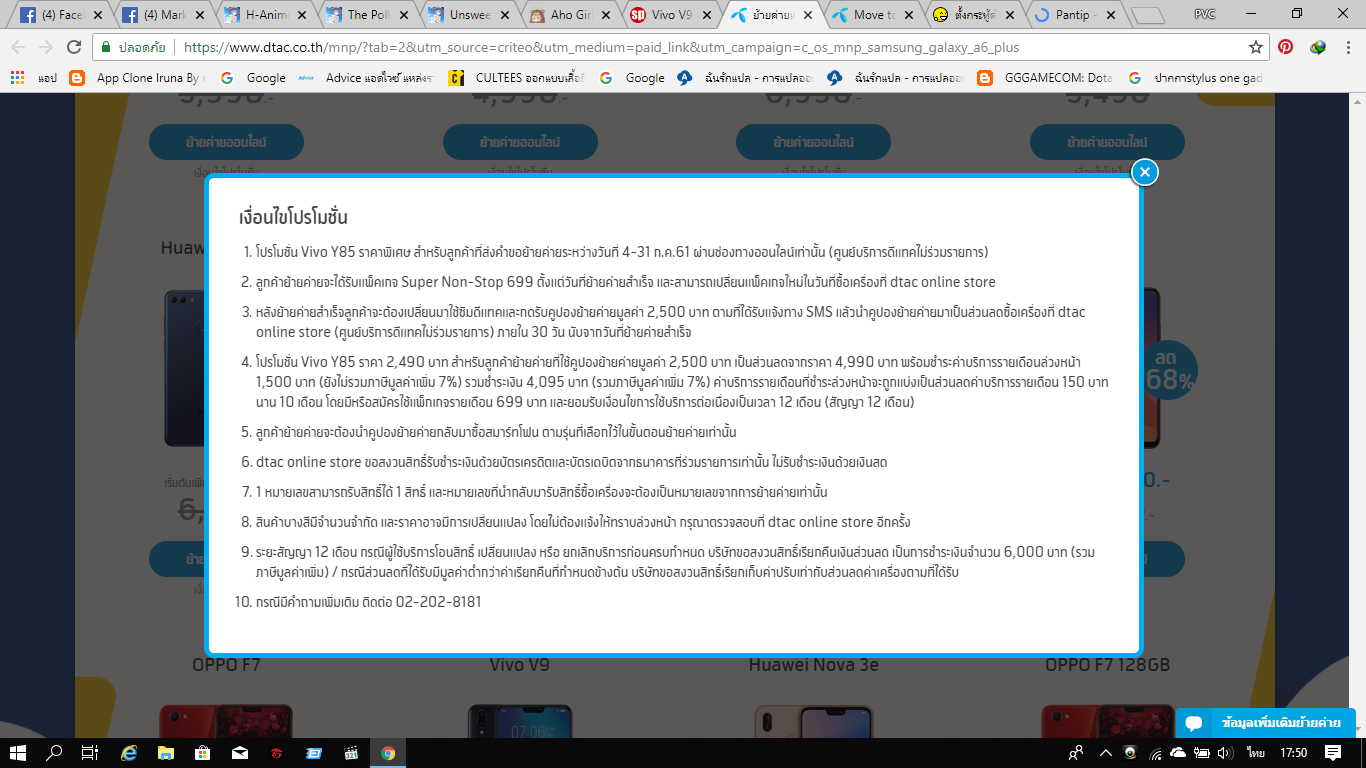 4. โปรโมชั่น Vivo Y85 ราคา 2,490 บาท สำหรับลูกค้าย้ายค่ายที่ใช้คูปองย้ายค่ายมูลค่า 2,500 บาท เป็นส่วนลดจากราคา 4,990 บาท พร้อมชำระค่าบริการรายเดือนล่วงหน้า 1,500 บาท (ยังไม่รวมภาษีมูลค่าเพิ่ม 7%) รวมชำระเงิน 4,095 บาท (รวมภาษีมูลค่าเพิ่ม 7%) ค่าบริการรายเดือนที่ชำระล่วงหน้าจะถูกแบ่งเป็นส่วนลดค่าบริการรายเดือน 150 บาทนาน 10 เดือน โดยมีหรือสมัครใช้แพ็กเกจรายเดือน 699 บาท และยอมรับเงื่อนไขการใช้บริการต่อเนื่องเป็นเวลา 12 เดือน (สัญญา 12 เดือน)