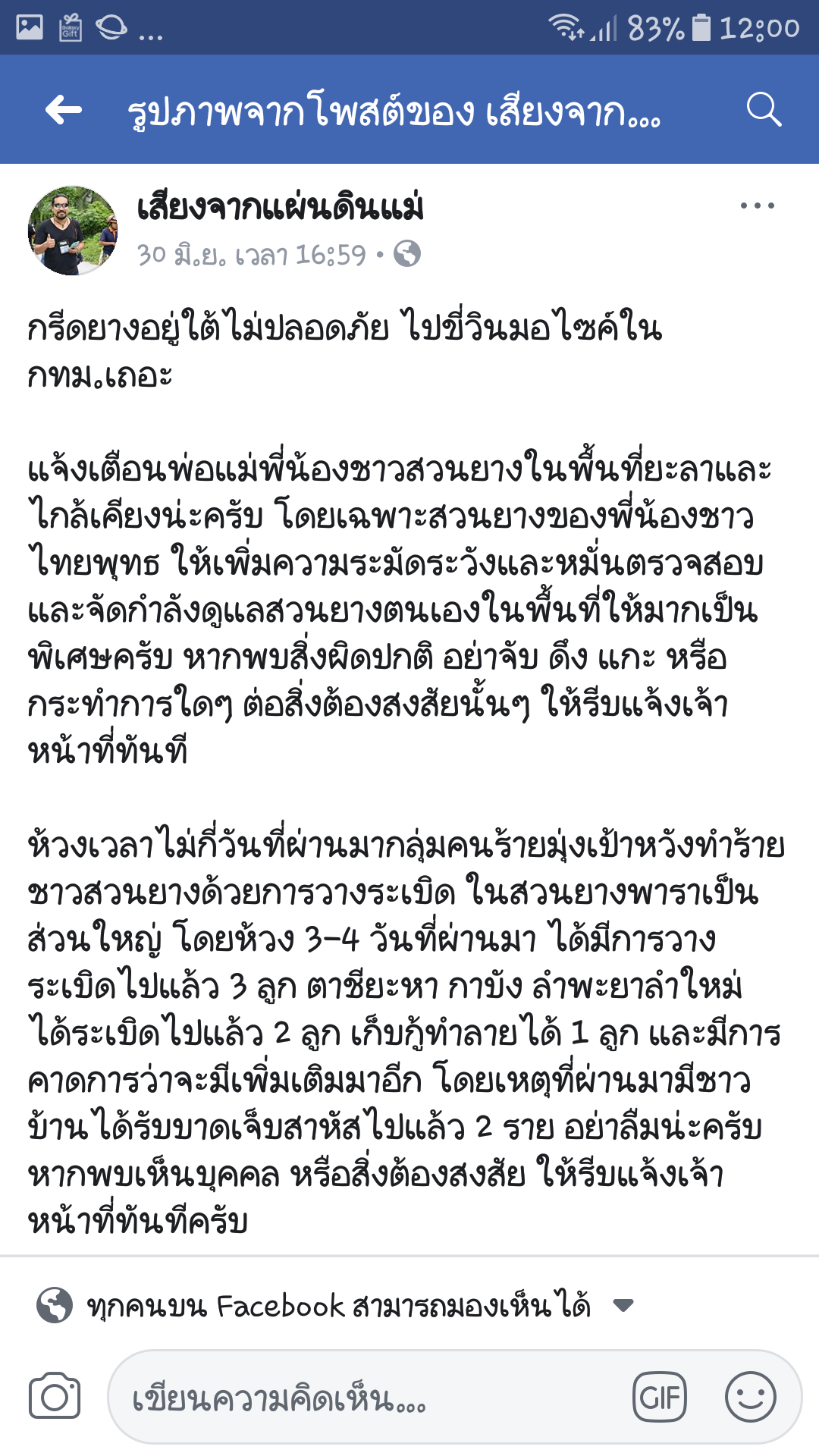 แจ้งเตือน ช่วงนี้ ขจก.กำลังเน้นวางระเบิดสวนยางไทยพุทธในยะลา