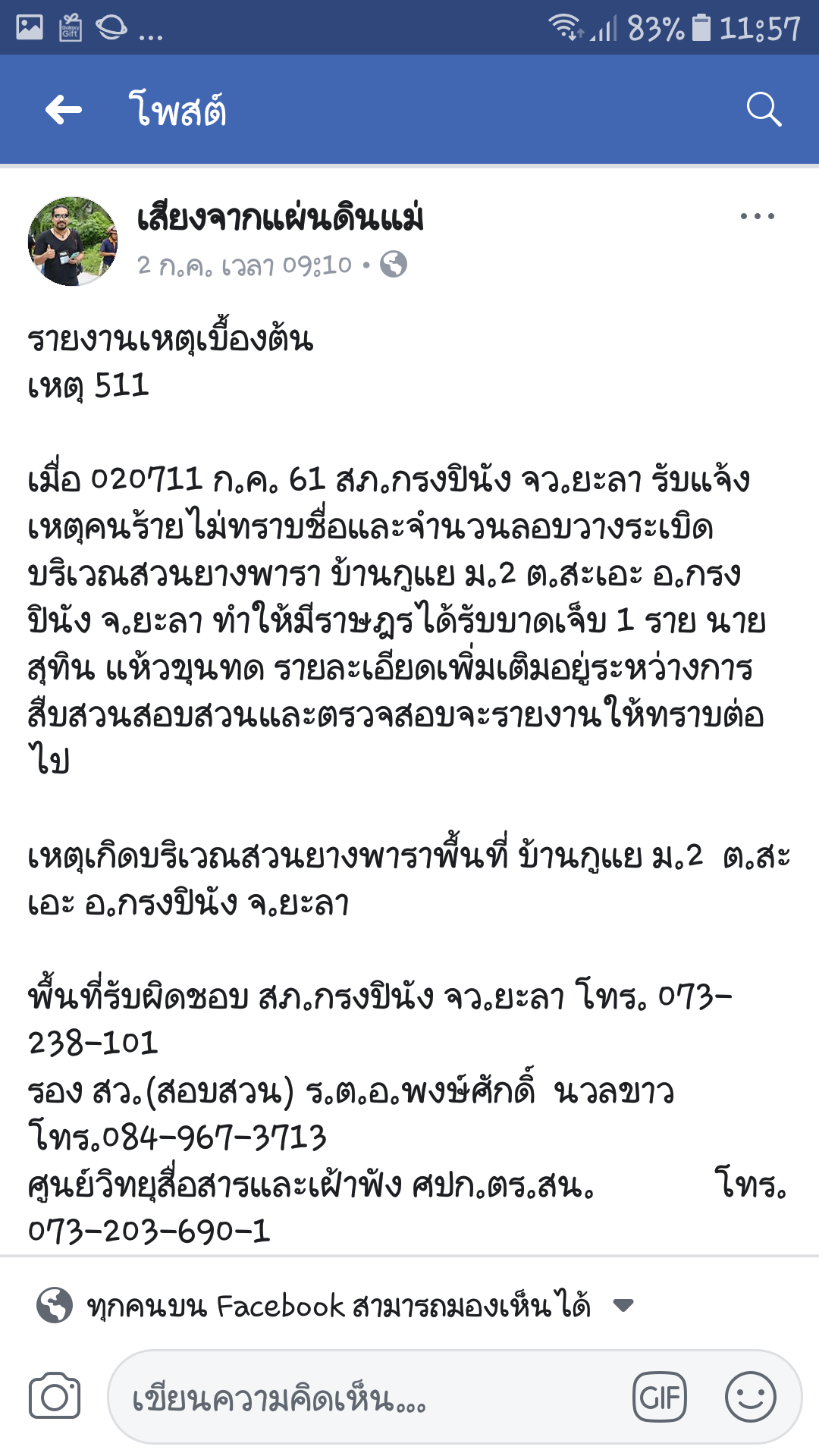 ตูมสนั่น!!! โจรใต้ ลอบวางระเบิด!!! วางเพลิง!!! บ.ก่อสร้าง โรงงานยาง ใน 3 อำเภอ!!! จ.ยะลา 16 กุมภาพันธ์ 2560 - โดย MGR Online ยะลา - ด่วน! หลังเที่ยงคืนที่ผ่านมา เกิดเหตุมีกลุ่มคนร้ายกระจายกันสร้าง