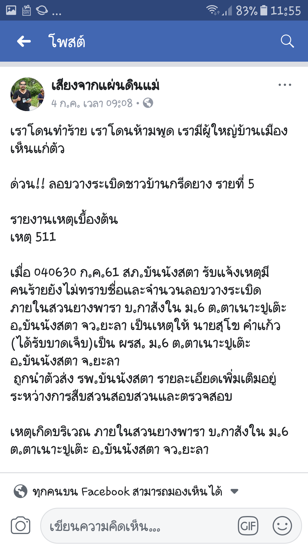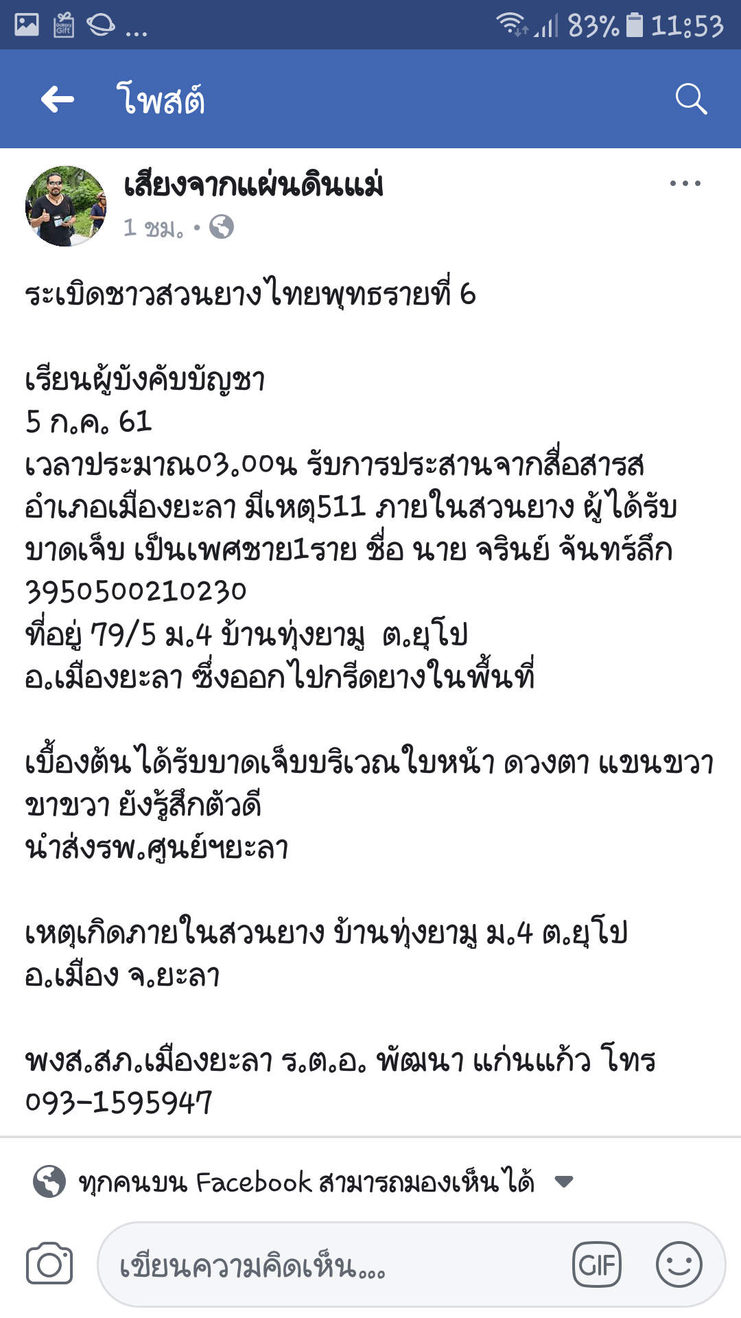 จนถึงวันนี้ก็ยังคงมีเหตุลอบทำร้ายชาวสวนยางไทยพุทธอยู่เรื่อยๆ ทั้งยุโป ลำพะยา ยะหา กาบัง บันนังสตา กรงปีนัง ... พื้นที่ จ.อื่นก็ต้องเฝ้าระวังด้วยนะครับ อย่าชะล่าใจ โจรมันจ้องเวลาที่เราหย่อนยาน ...