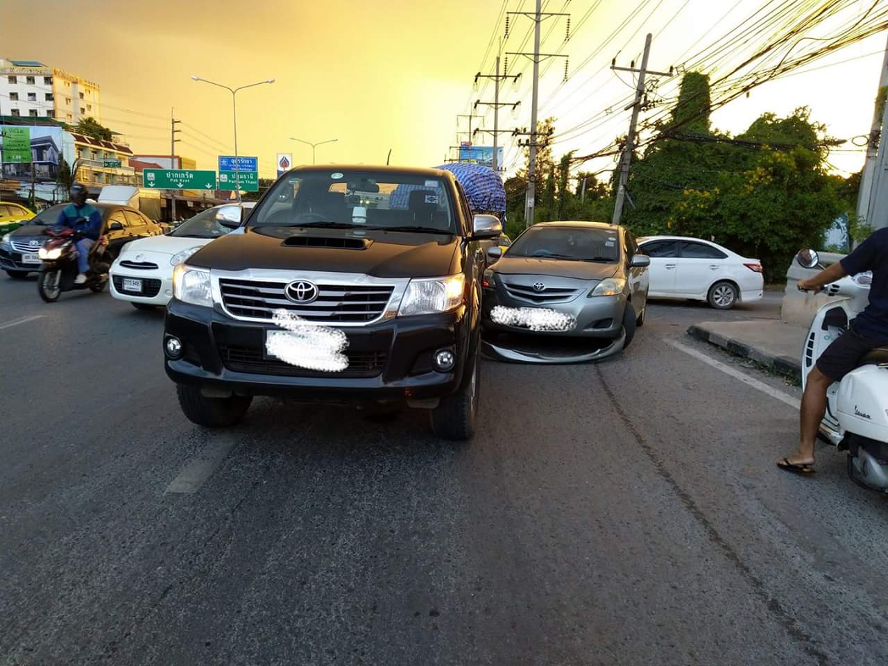 ผมขับรถเก๋งออกมาจากถนนเลียบคลองเปรมประชากร เส้น workpoint เมื่อมาถึงปากทางได้หยุดรถดูทางขวา พอเห็นรถแท็กซี่สีเหลืองหยุดให้ เลยเลี้ยวซ้ายเข้าถนนหลักเพื่อที่จะยูเทิร์นใต้สะพาน แต่ขณะที่เลี้ยวออกมาได้เบียดกับรถกระบะดำโดยเกิดการชนกันบริเวณซุ้มล้อหน้าขวา ส่วนรถกระบะโดนตั้งแต่กลางคันลากยาวมาถึงท้ายรถ ผมเรียกประกันมา และถ่ายรูปไว้ พนักงานประกันบอกว่ามันก้ำกึ่งคือเหมือนรถกระบะจะเปลี่ยรจากเลน 2 มาเลน 1 ในช่องทางที่ผมเลี้ยว แต่คู่กรณีบอกอย่างเดียวว่าผมผิด (รถกระบะไม่มีประกัน) คุยกันไม่รู้เรื่อง ผมเลยชวนไปโรงพักเพื่อที่จะได้ชี้ถูกผิด ถ้าผมผิดผมก็ยอมรับ ที่ผมยังไม่ยอมรับเพราะข้อมูลจากพนักงานประกันบอกก้ำกึ่ง คือผมแค่อยากให้คลายสงสัยแค่นั้นเอง แต่คู่กรณีไม่ยอมไป บอกว่ายังไงผมก็ผิด ไม่อยากคุยแล้วฝ เค้าเลยขับรถออกไป พอวันรุ่งขึ้นเค้าไปแจ้งความพร้อมกับเมียเค้า ให้ตำรวจโทรมาหาบอกให้ผมไปโรงพัก ซึ่งผมไม่สามารถไป ณ ตอนนั้นได้ เลยขอไปในวันรุ่งขึ้น เมียพี่คนขับบอกว่าเค้าไปให้ตำรวจหรือหัวหน้าประกันที่เค้ารู้จักดุรูป ตำรวจชี้ว่ายังไงผมก็ผิด ซึ่งผมยังไม่มีโอกาสไปให้ปากคำเลย (ผิดก็คือผิดผมยอมรับได้ ผมแค่อยากให้ไปหาตำรวจเพื่อตัดสินแค่นั้น แต่เค้าไม่ไปตั้งแต่ทีแรก)