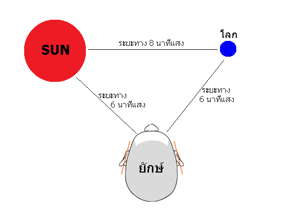 ถ้าเราเป็นยักษ์เห็นSUNกับโลกห่างกันแค่ข้ามไหล่เราเท่านั้น ถ้าเอากล่องครอบSUNแล้วเลิกครอบ เราจะเห็นหัวแสงวิ่งช้าๆไหมครับ