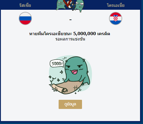 เมื่อวานเชียร์เบลเยี่ยม เบลแพ้ไปแล้ว แต่วันนี้ผมเชียร์โครเอเชียเป็นทีมที่เชียร์มากที่สุดในบอลโลกครั้งนี้ แต่จากสถิติบอกว่า เชียร์ทีมไหนทีมนั้นพัง เพราะฉะนั้นวันนี้ ใครมีเท่าไหร่ลงอังกฤษให้หมดครับ อังก