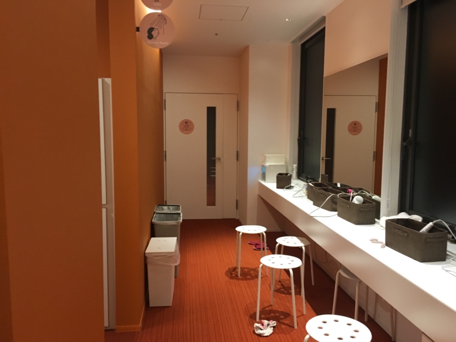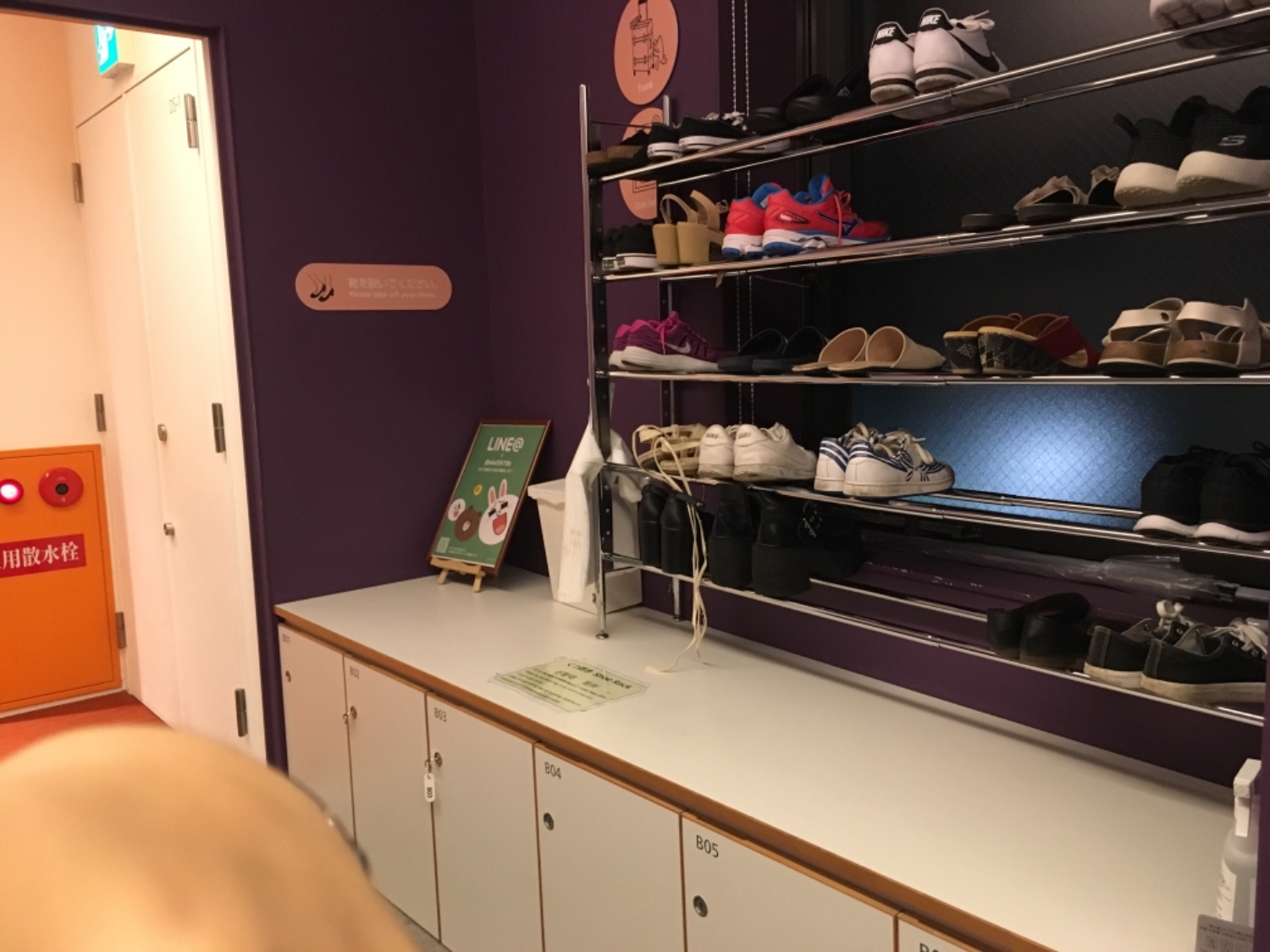ขึ้นบันไดมาจะเจอที่วางรองเท้า ถ้าจะใช้ล็อกเกอร์ก็ได้ค่ะ แต่ต้องใส่ถุงที่เค้าเตรียมไว้ให้