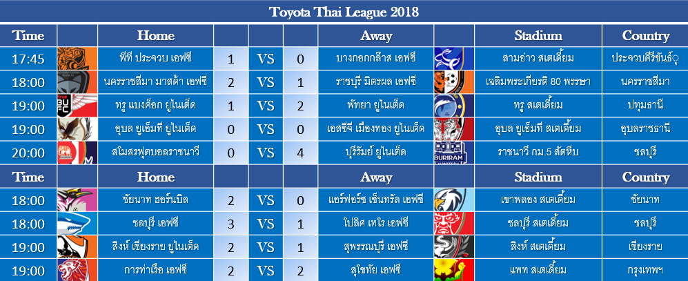 สรุปผลฟุตบอล ไทยลีก 2018 ประจำวันเสาร์ที่ 28 กรกฏาคม 2561 พร้อมตารางคะแนน