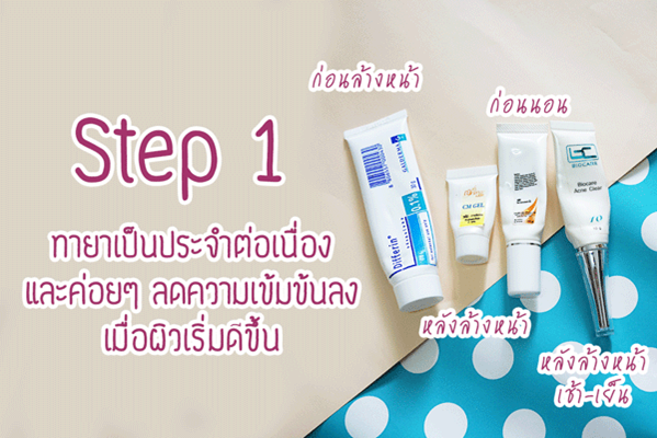 เริ่มที่อันดับแรก เราเลิกหาหมอเลิกฉีดสิวพยายามทายาต่อเนื่องทั้งก่อนล้างหน้า หลังล้างหน้า ก่อนนอน สำคัญมากจริงๆ แล้วก็อาจจะมีแอบไปคลินิกบ้างแต่ไม่ฉีดนะ ไปฉายแสง Blue light หรือเลเซอร์สิวอุดตันเอา เพราะเวลาที่ทายาแล้วเนี่ยสิวจะหลุดออกง่ายมาก แล้วสิวอุดตันก็น้อยลงด้วย โดยกลุ่มยาที่ขาดไม่ได้ก็มีดังนี้