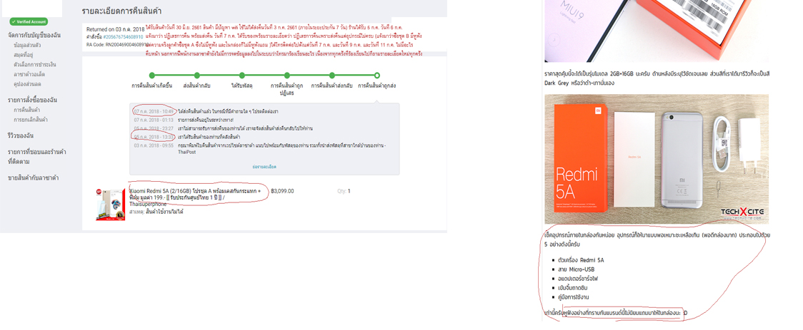 5. วันที่ 7 ก.ค. 2561 ได้รับของคืนมา ด้านในระบุเอกสารว่าปฏิเสธการคืนเพราะส่งคืนมาแต่อุปกรณ์ไม่ครบ (แจ้งมาว่าซื้อชุดโปรชุด B ซึ่งมีหูฟังแถม แต่ลูกค้าซื้อชุดโปรชุด A ซึ่งไม่มีหูฟัง และในกล่องสินค้าก็ไม่มีหูฟังแถม)