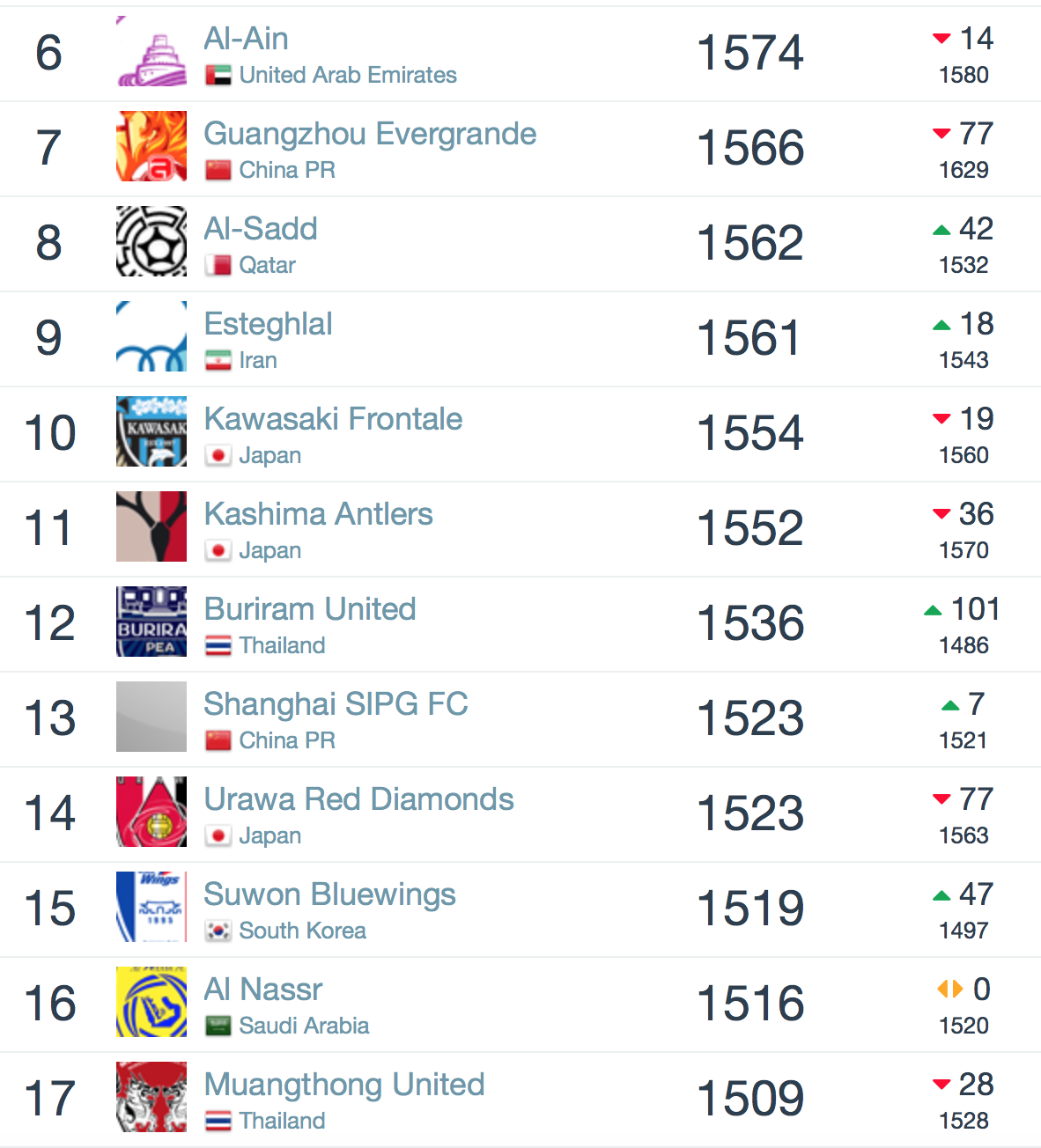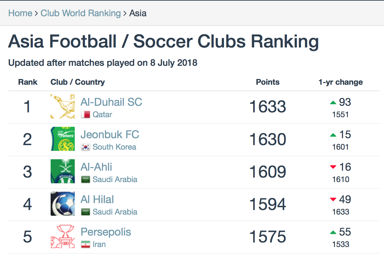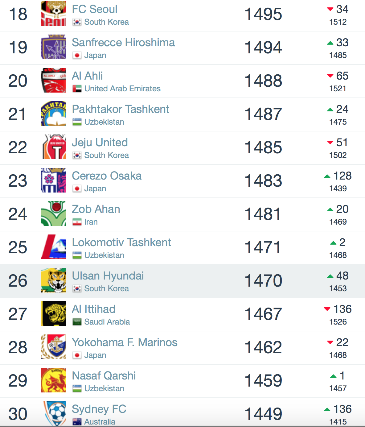 อัพเดทอันดับแรงกิ้งสโมสรฟุตบอลเอเซียล่าสุด วันที่ 8 ก.ค. 2018