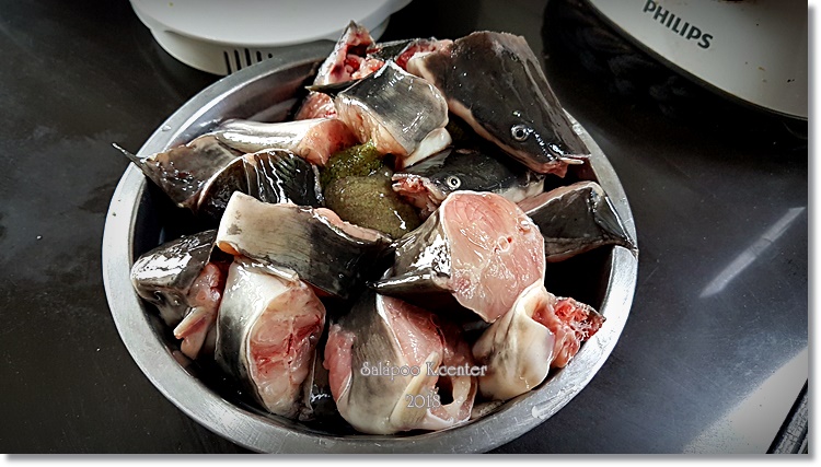 ปลาดุก 2 ตัว ให้แม่ค้าทำมาจากตลาดนำมาล้างด้วยเกลือป่น น้ำส้มสายชู เตรียมพร้อม