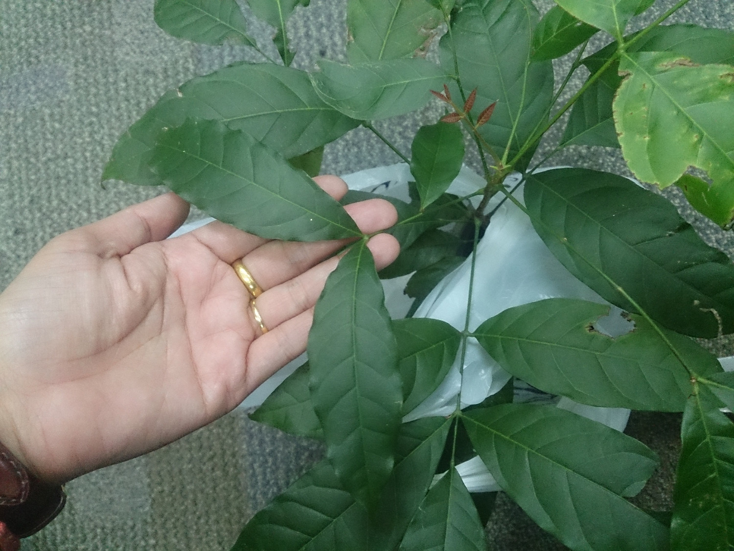 เทียบขนาดใบกับมือค่ะ อาจไม่ใหญ่มากเพราะเลี้ยงในกระถางเล็กนิดเดียว เค้าคงอึดอัด