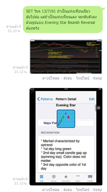 SET วันจ 13/7/61 ......ถ้า เขียว ได้ไปต่อ แต่ ถ้า แดง คือ Evening Star Bearish Reversal......