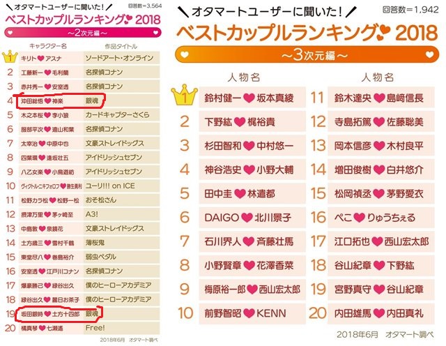 เป็นผลโหวตที่เอามาจากทวิตเตอร์ของ animatetimes ค่ะ แบ่งออกเป็นคู่ 2d แล้วก็คู่ 3d