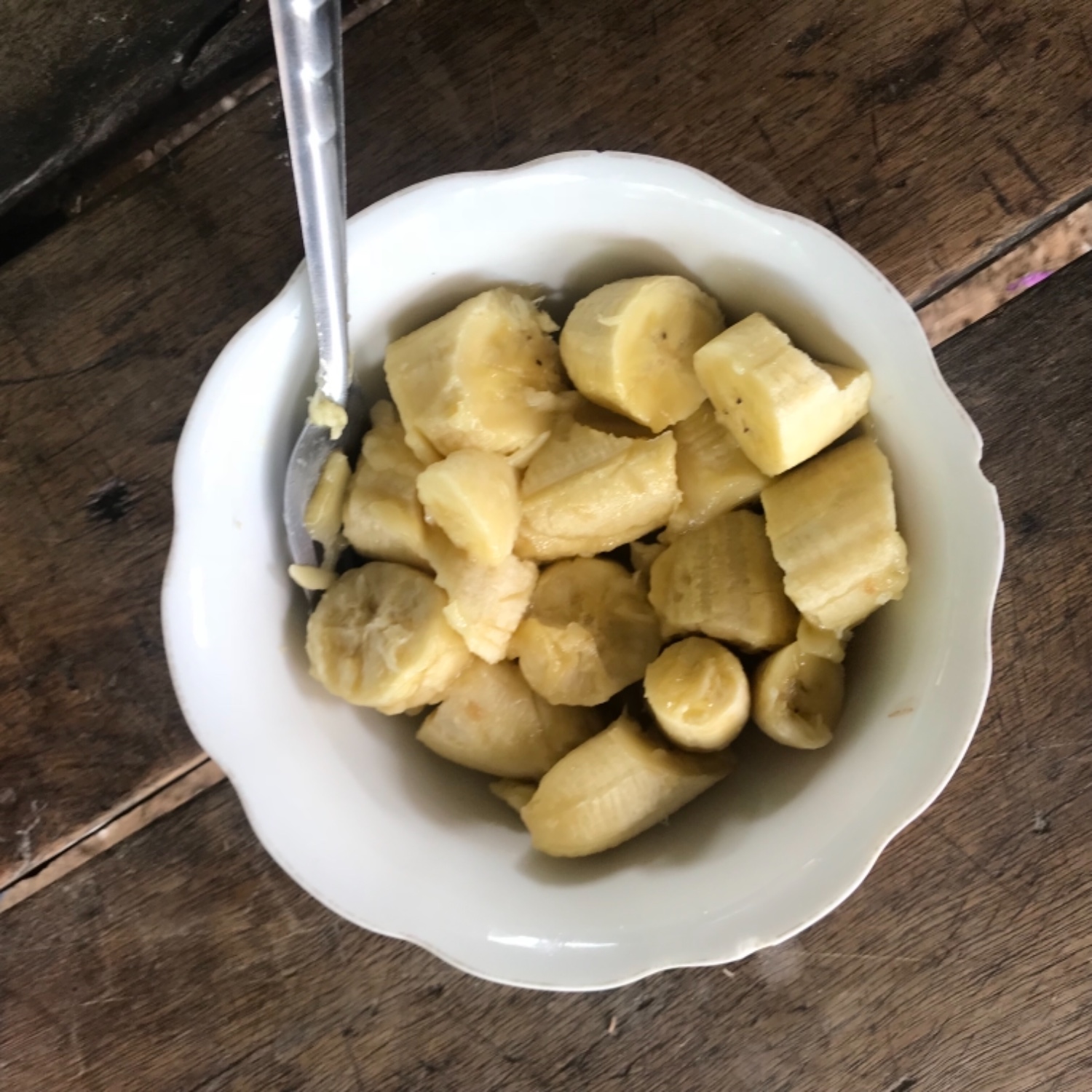 1. เริ่มจากน้ำกล้วยหอมสุกมาหั่นและบดให้เละค่ะ