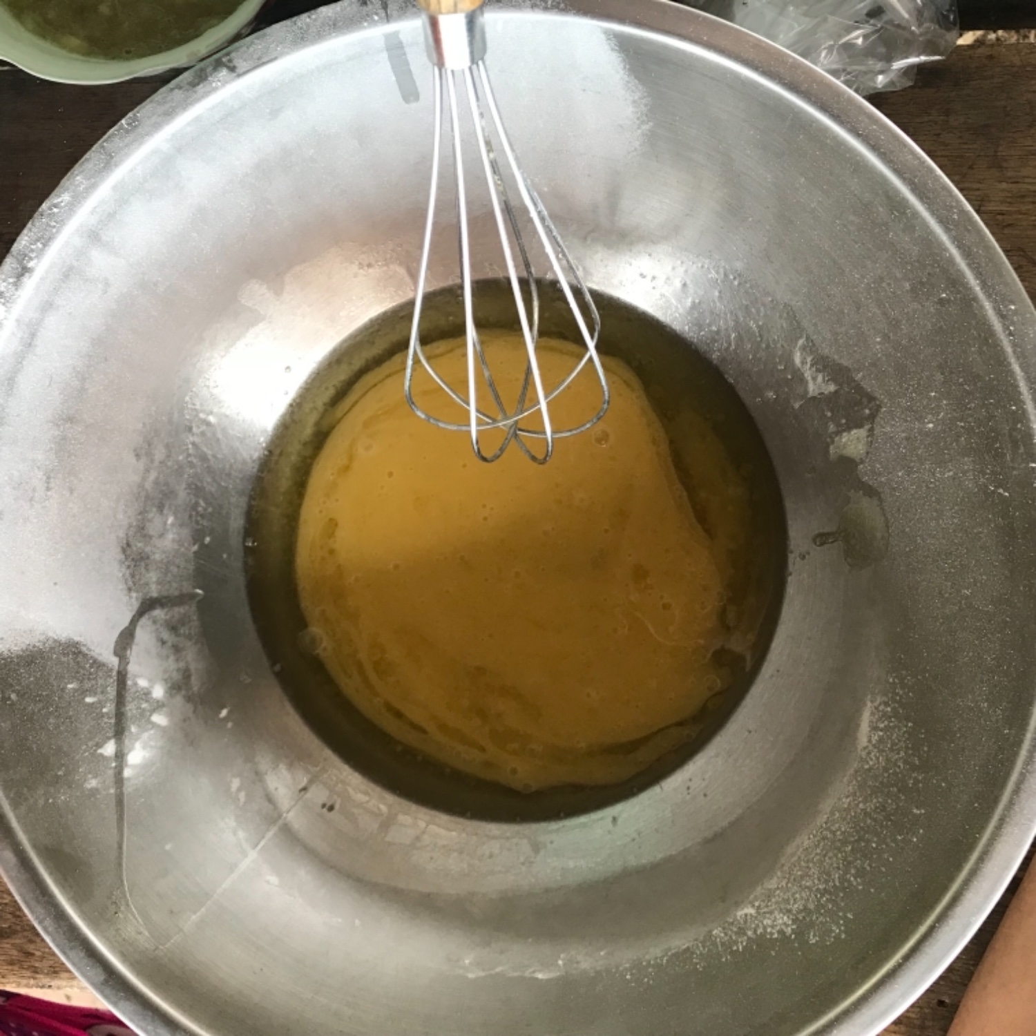 4. เตรียมน้ำมัน และนำไข่ลงไปตีผสมให้เข้ากันค่ะ