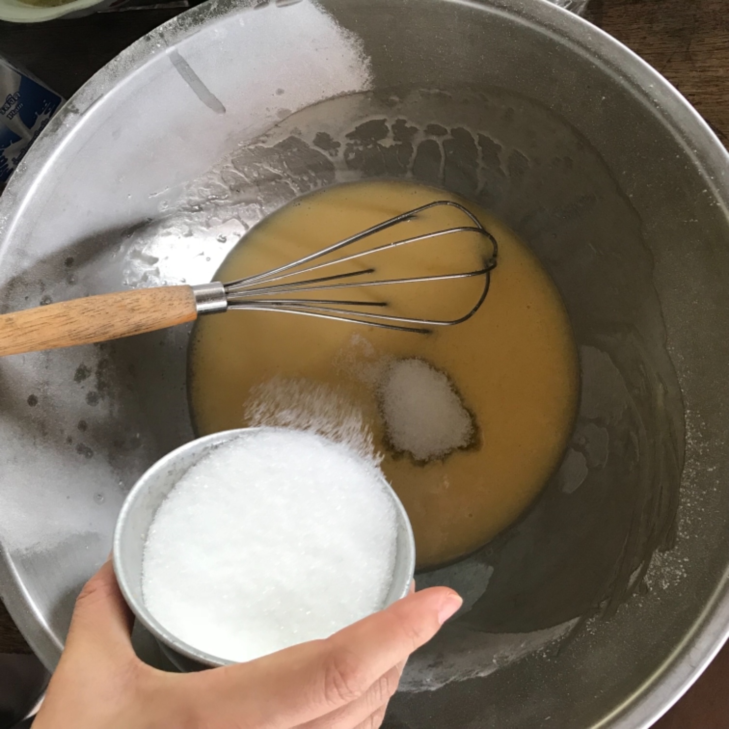 5. ตีเข้ากันแล้วก็เริ่มเทน้ำตาลและเกลือที่เตรียมไว้ลงไปผสมได้เลยค่ะ