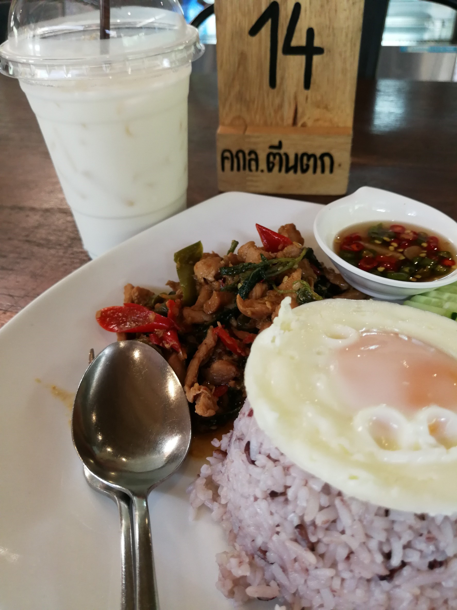 เที่ยงแล้วก็ถึงเวลากินข้าว เลยขับรถลงเขาเพื่อไปยังโครงการหลวงตีนตก เมนูก็เบสิค กระเพราไก่ไข่ดาวเนอะ อิ่มมากเพราะทางโครงการใช้ข้าวกล้อง(มั้ง ไม่แน่ใจชื่อสายพันธ์ข้าวนะ) ในการทำ สั่งนมสดเย็นมากินด้วย เมื่อกินข้าวเสร็จแล้วก็เดินมานั่งเพื่อรอเวลา จะได้ไม่ขับรถร้อนเกินไป ชิลจนอยากหลับมาก แต่กลัวพนักงานตกใจ