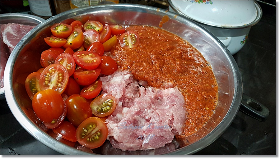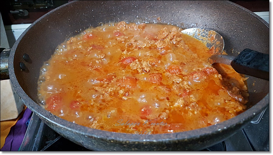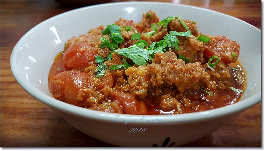 น้ำล้างกะละมังใส่ลงไปแค่นิดหน่อย ผัดต่อจนมะเขือเทศสุกเละ น้ำพริกในกระทะค่อนข้างแห้ง เป็นความชอบส่วนตัวอีกแหละ