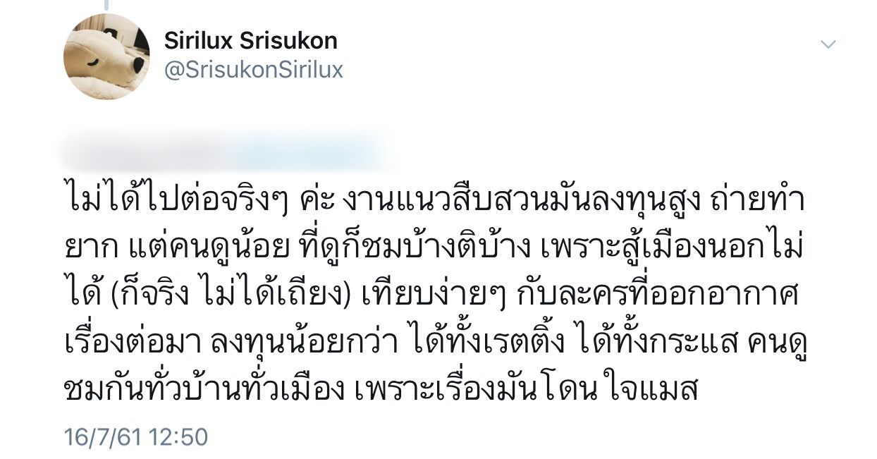 เพราะทำออกมาแล้วเรตติ้งไม่ดี คนดูน้อย สู้ละครแนวผัวๆ เมียๆ ไม่ได้ คนไทยส่วนใหญ่ชอบแบบนี้มากกว่า
