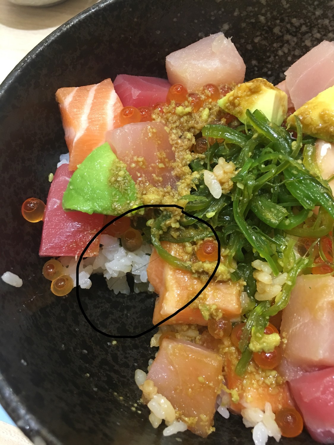 ก็เห็นเส้นอะไรบางอย่างคล้ายเส้นผมอยู่ในยำสาหร่าย (ถ้าใครชอบข้าวหน้าปลาดิบแบบเราจะทราบว่าข้าวหน้าปลาดิบจะมียำสาหร่ายอยู่ตรงกลางเนอะ)