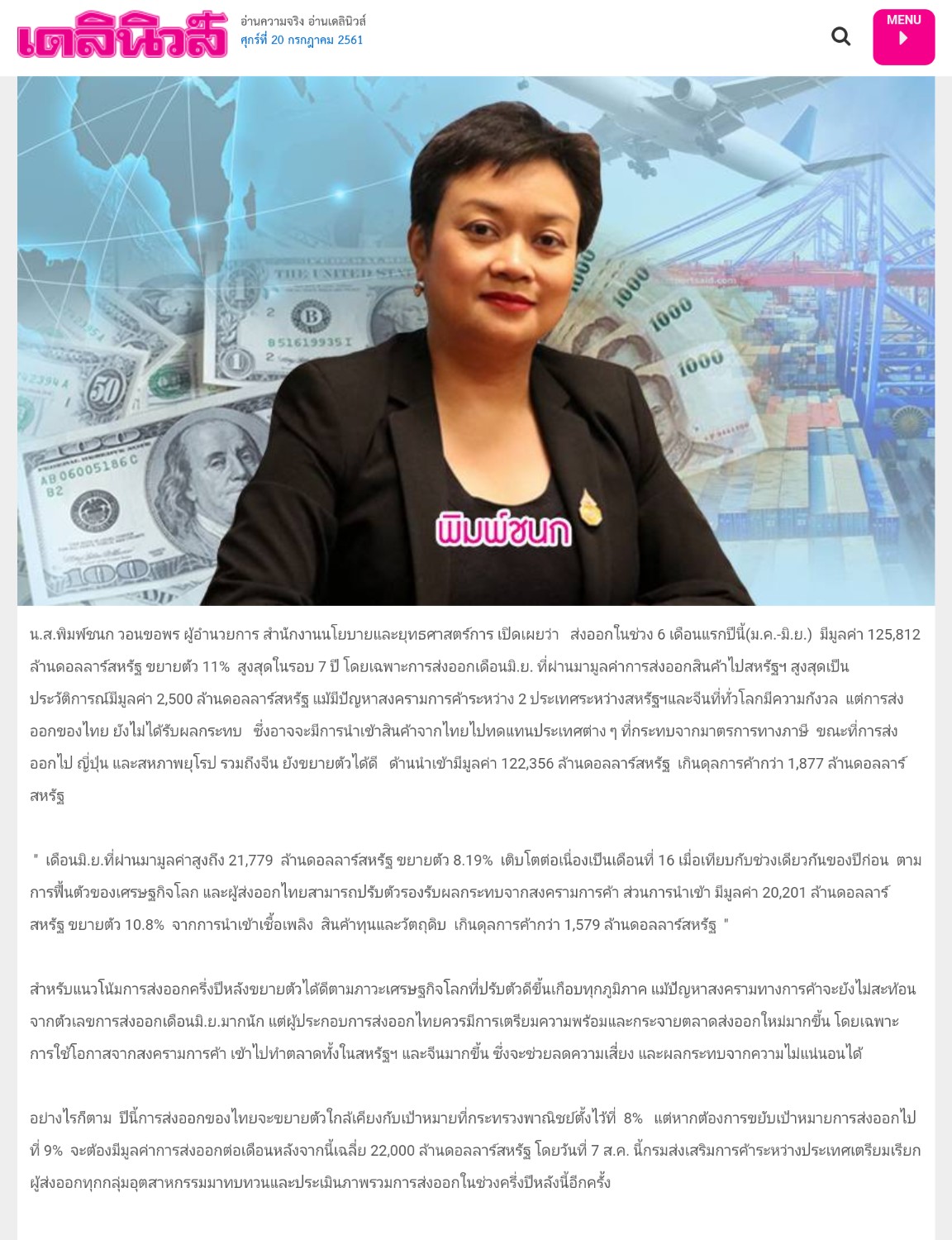 พาณิชย์เผยตัวเลขส่งออก 6 เดือนมีมูลค่า125,812 ล้านดอลลาร์สหรัฐ ขยายตัว 11% สูงสุดในรอบ 7 ปี เดือนมิ.ย. โต 8.19% ยันสงครามทางการค้าไม่กระทบ นัดถกเอกชน 7 ส.ค. ทบทวนตัวเลขใหม่