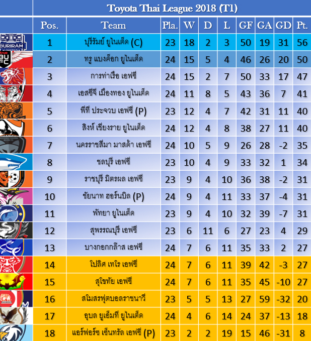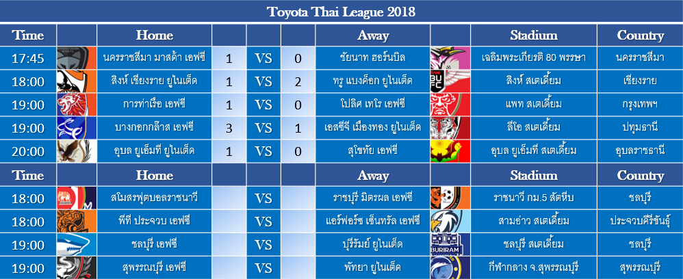 สรุปผลฟุตบอล ไทยลีก 2018 ประจำวันเสาร์ที่ 21 กรกฏาคม 2561 พร้อมตารางคะแนน